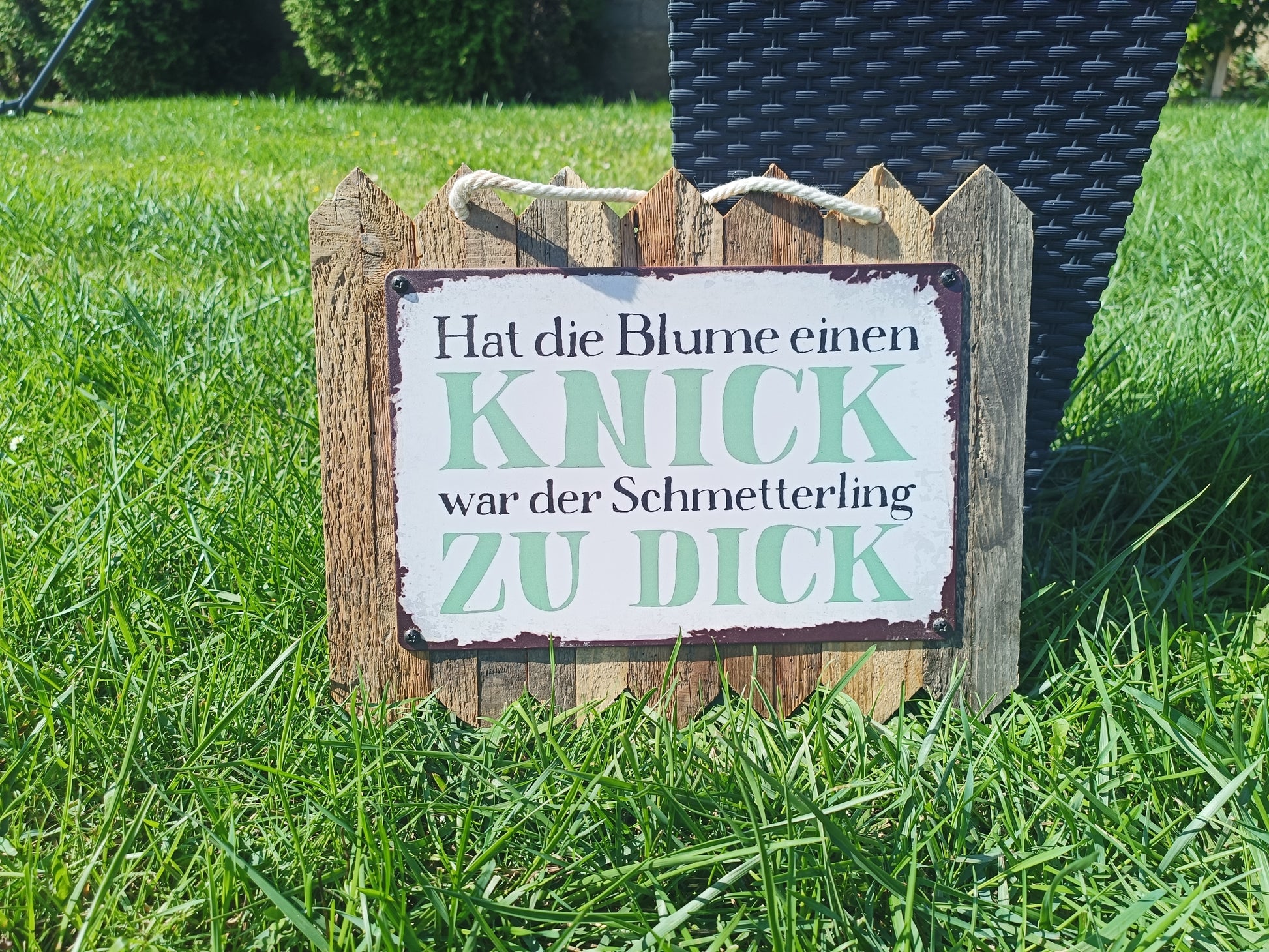 Blechschild – „Hat die Blume einen Knick, war der Schmetterling zu dick – Lustiges Garten Deko auf Altholz