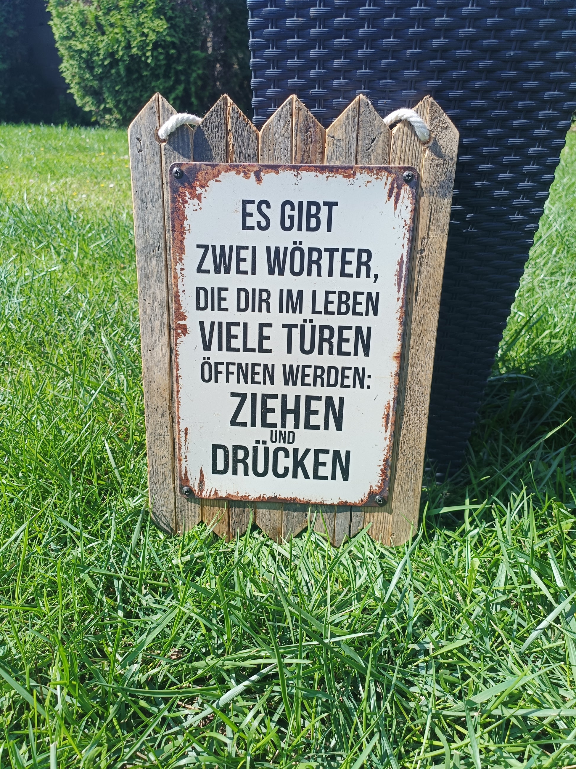 Humorous, clever, and absolutely practical: This tin sign on rustic reclaimed wood is guaranteed to bring laughter to any room with the saying "There are two words that open many doors for you: Pull and push." Perfect for hallways, entryways, offices, or as an original gift. Each sign is handcrafted and unique thanks to the natural wood texture.