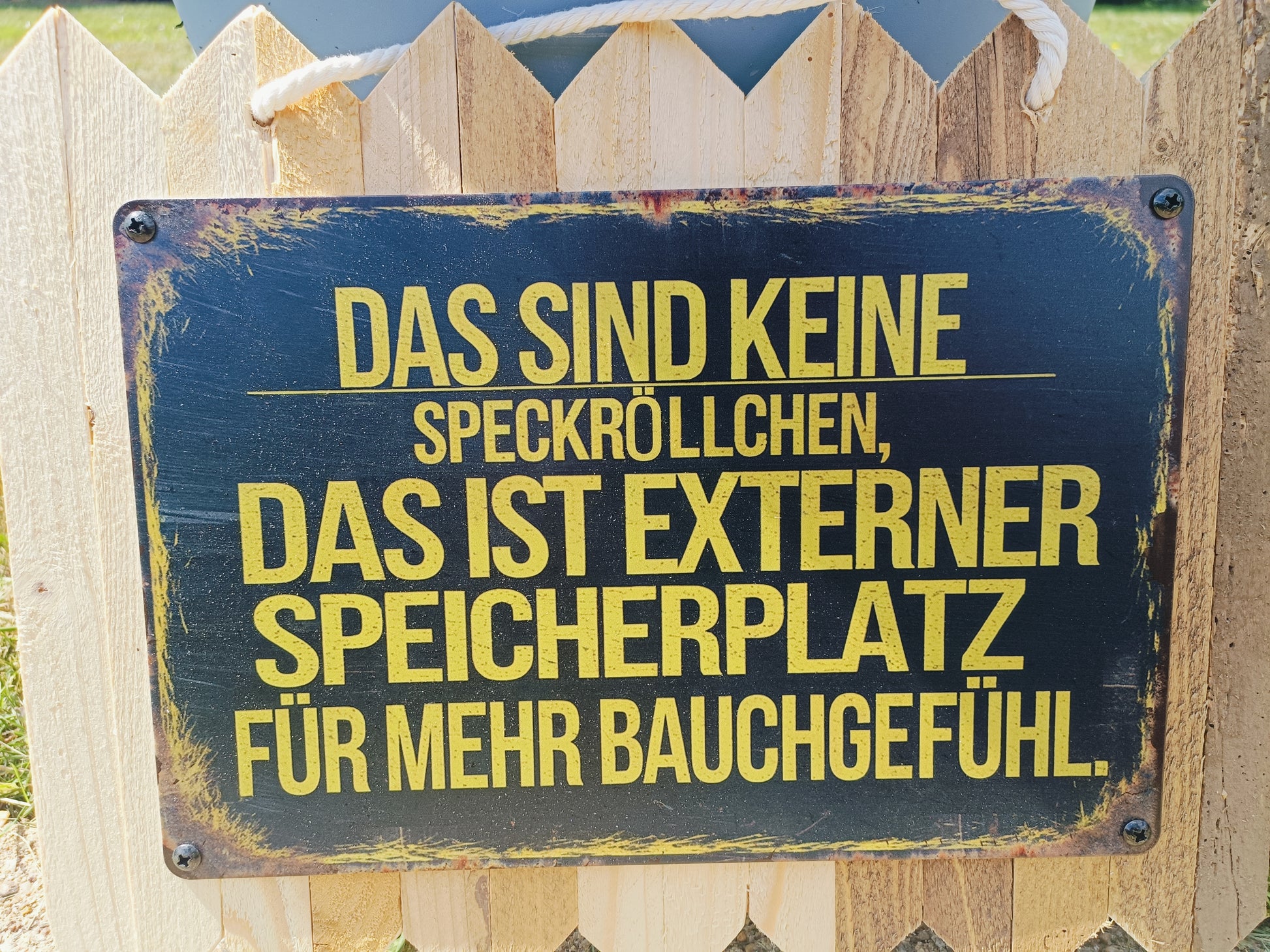 Metal sign "External storage space for more gut feeling, on old wood