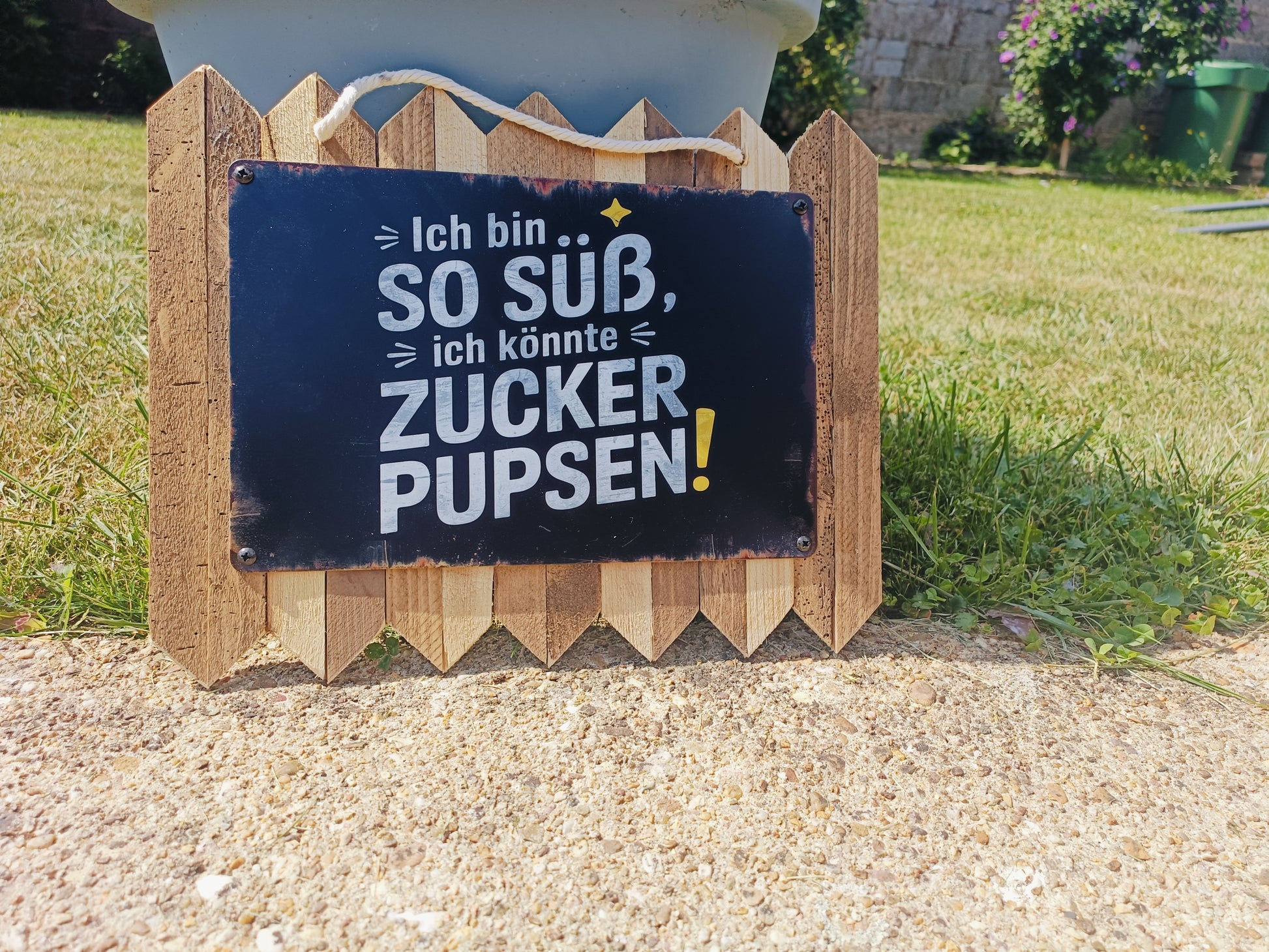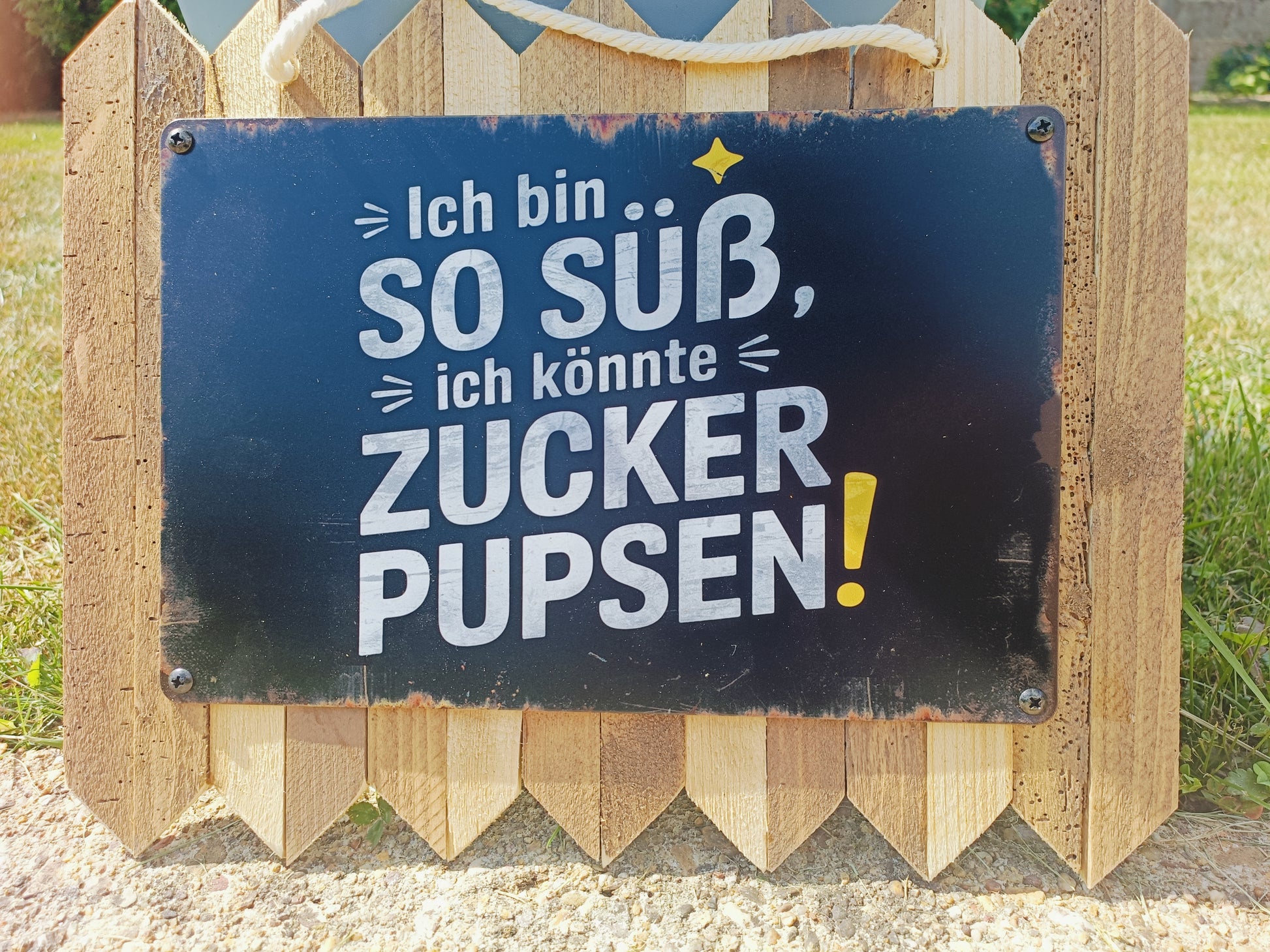 Cheeky, humorous, and simply a laugh-out-loud: This tin sign on rustic reclaimed wood with the saying "I'm so sweet, I could fart sugar" is guaranteed to brighten any room. Ideal as a wall decoration for the living room, children's room (with a wink 😉), or as an original gift. Each sign is handcrafted and unique thanks to the natural wood texture.