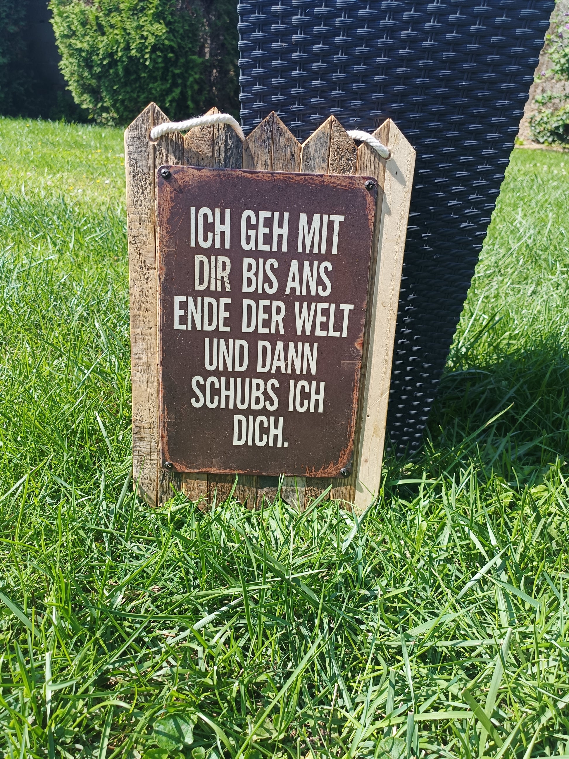 Cheeky, loving, and humorous: This tin sign on rustic reclaimed wood with the saying "I'll go with you to the ends of the earth – and then I'll push you" is guaranteed to bring laughter and good cheer to any room. Ideal for the living room, bedroom, or as an original gift. Each sign is handcrafted and unique thanks to the natural wood texture.