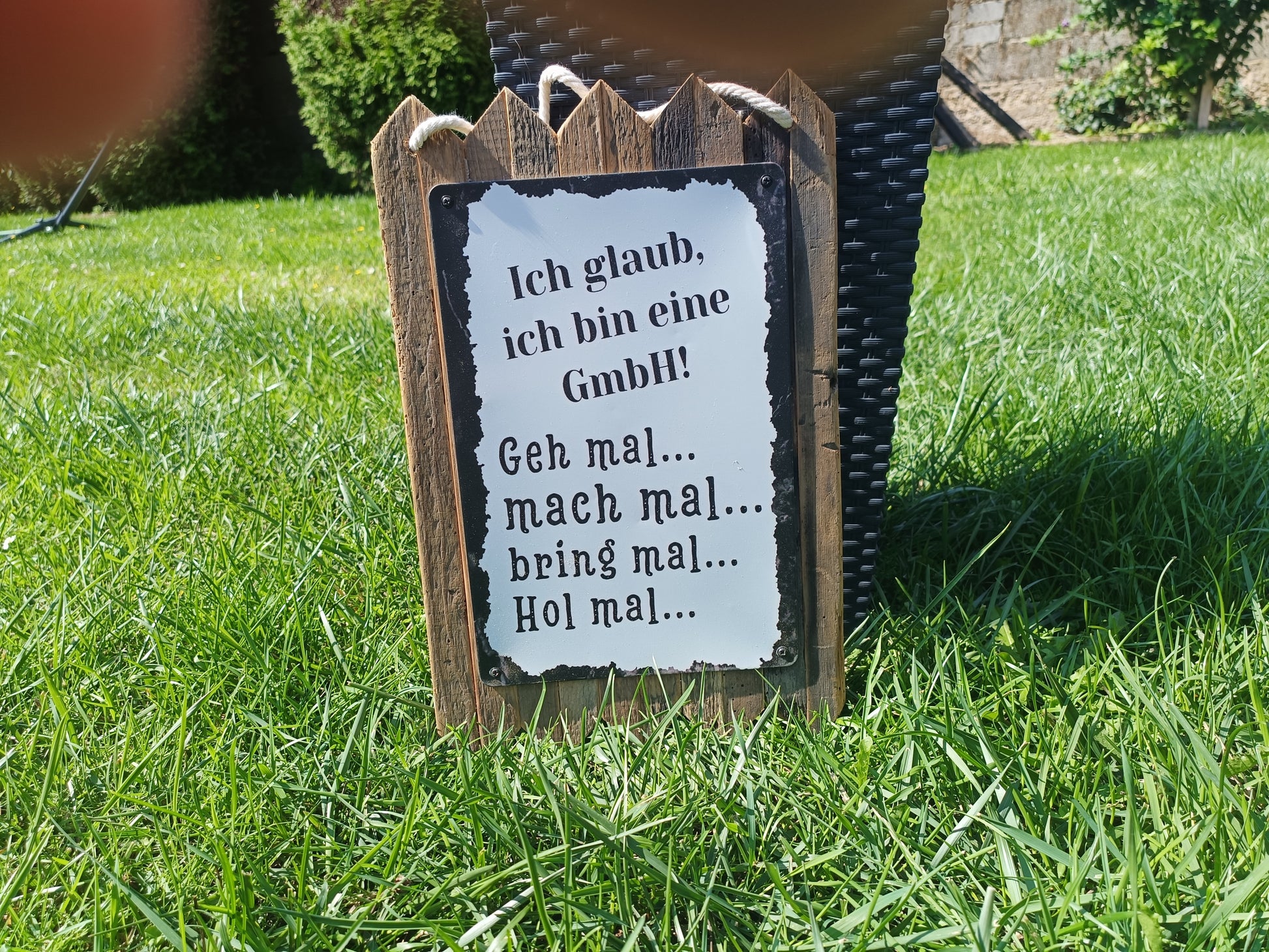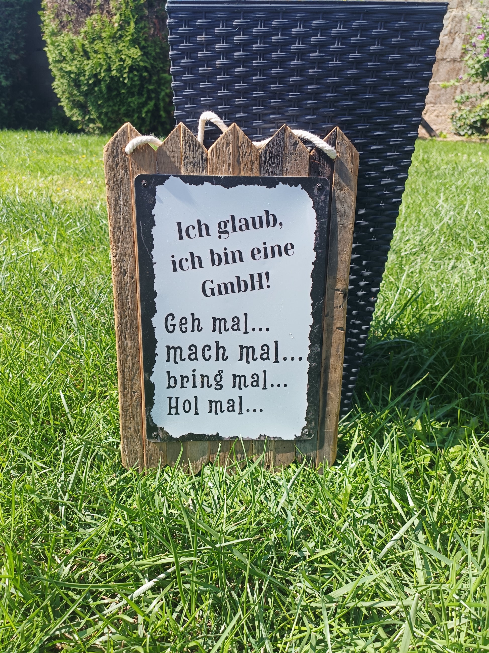 Tin sign saying – 'I think I'm a GmbH' | Funny saying sign, handmade wall decoration on reclaimed wood