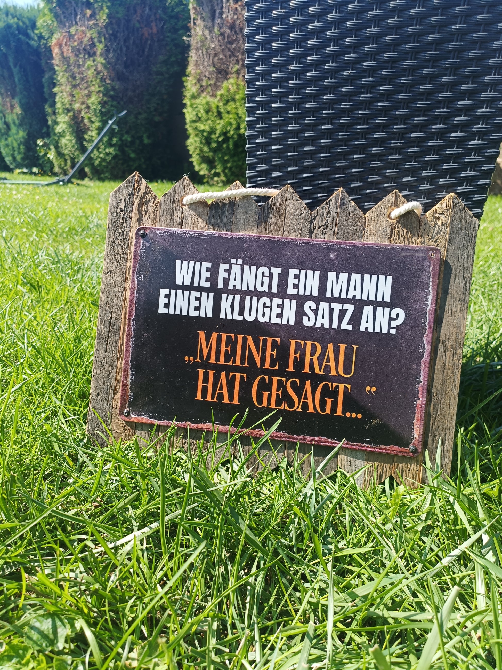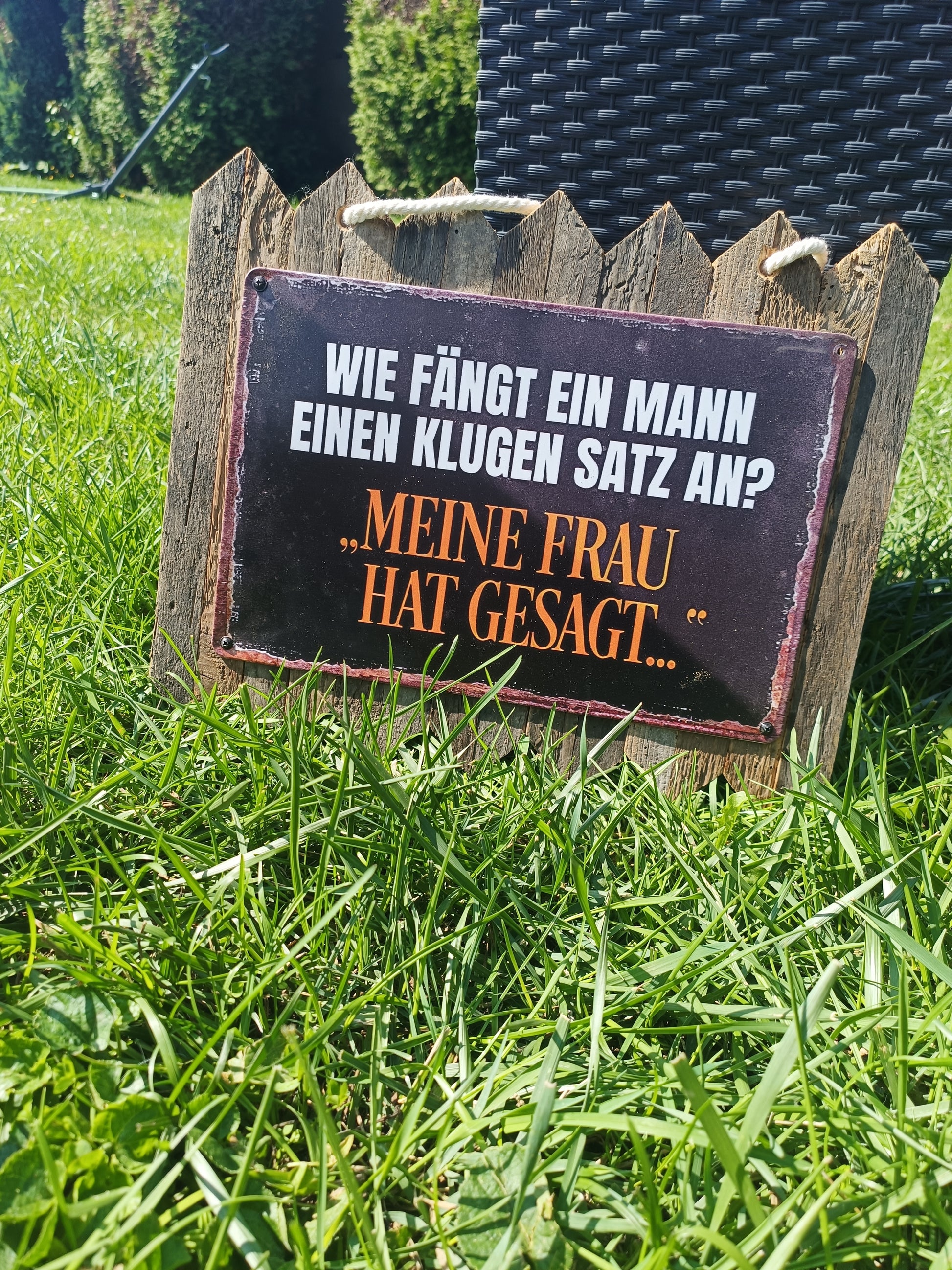 Cheeky, humorous, and a real eye-catcher: This metal sign on rustic reclaimed wood is guaranteed to bring laughter to any room with the saying "How does a man start a clever sentence? My wife said..." It's ideal as a wall decoration for the living room, office, or as an original gift. Each sign is handcrafted and unique thanks to the natural wood texture.