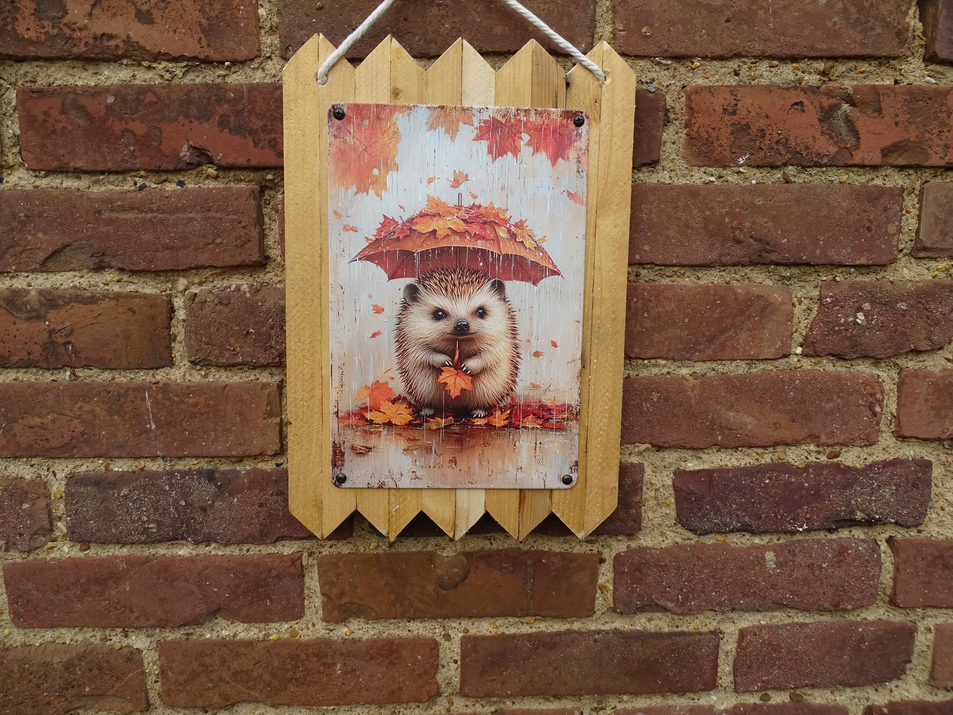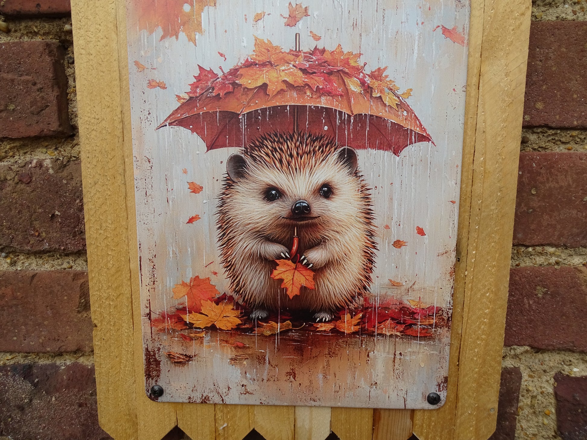 Blechschild - einzigartiger Igel mit Regenschirm - Herbst - Winter Dekoration - handgefertigt auf Altholz