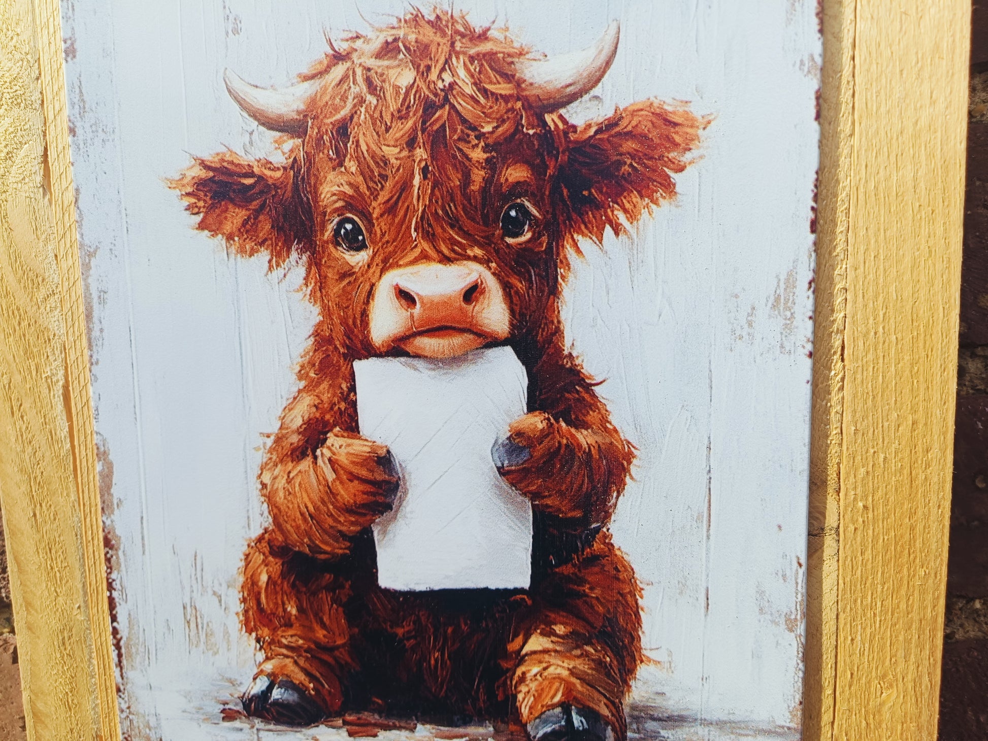 Tin sign Highland cattle with toilet paper roll – Funny toilet decoration, handmade wall sign
