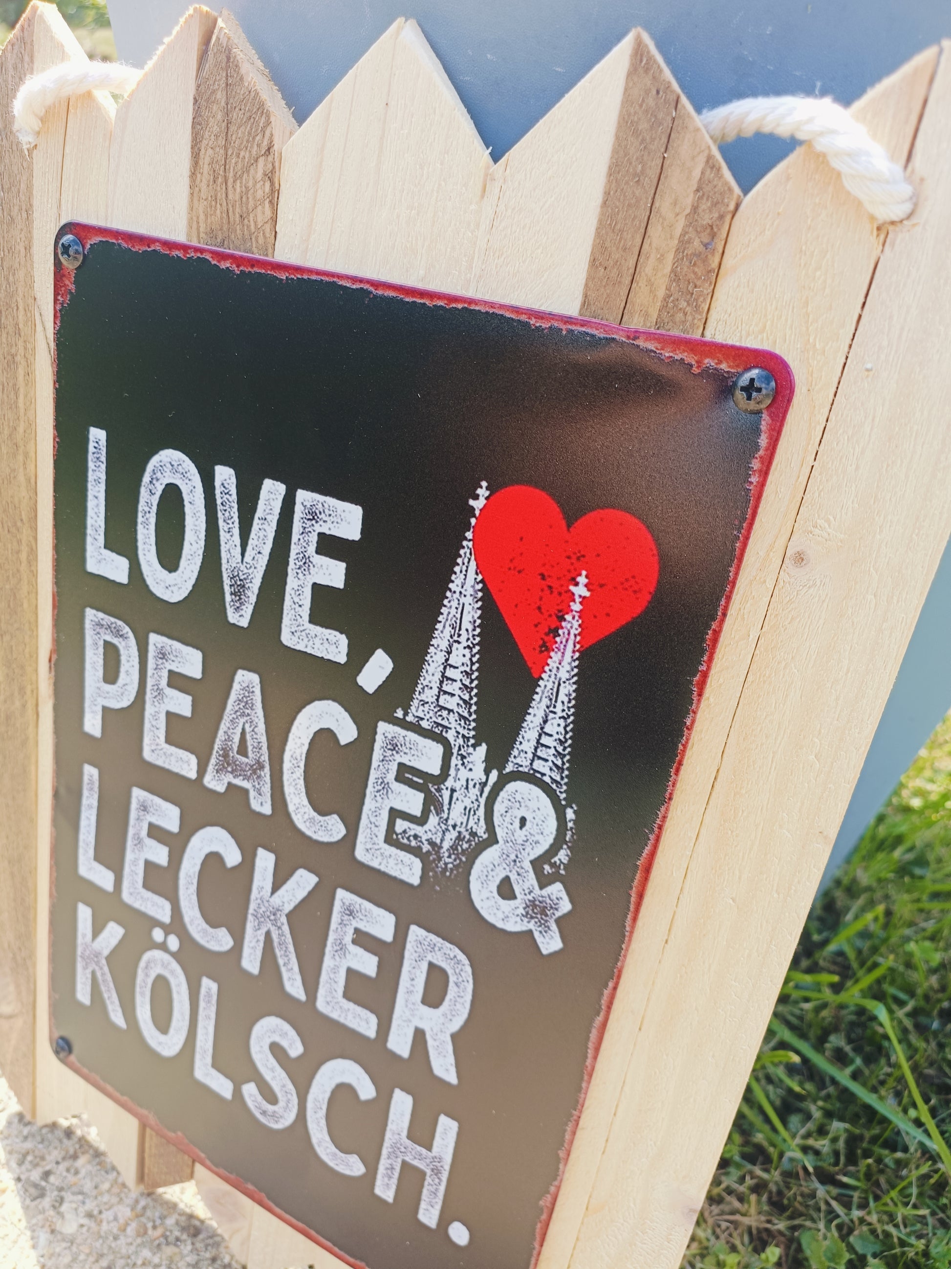 Blechschild " Love, Peace und Lecker Kölsch " Köln Dekoration Handgefertigt auf Altholz
