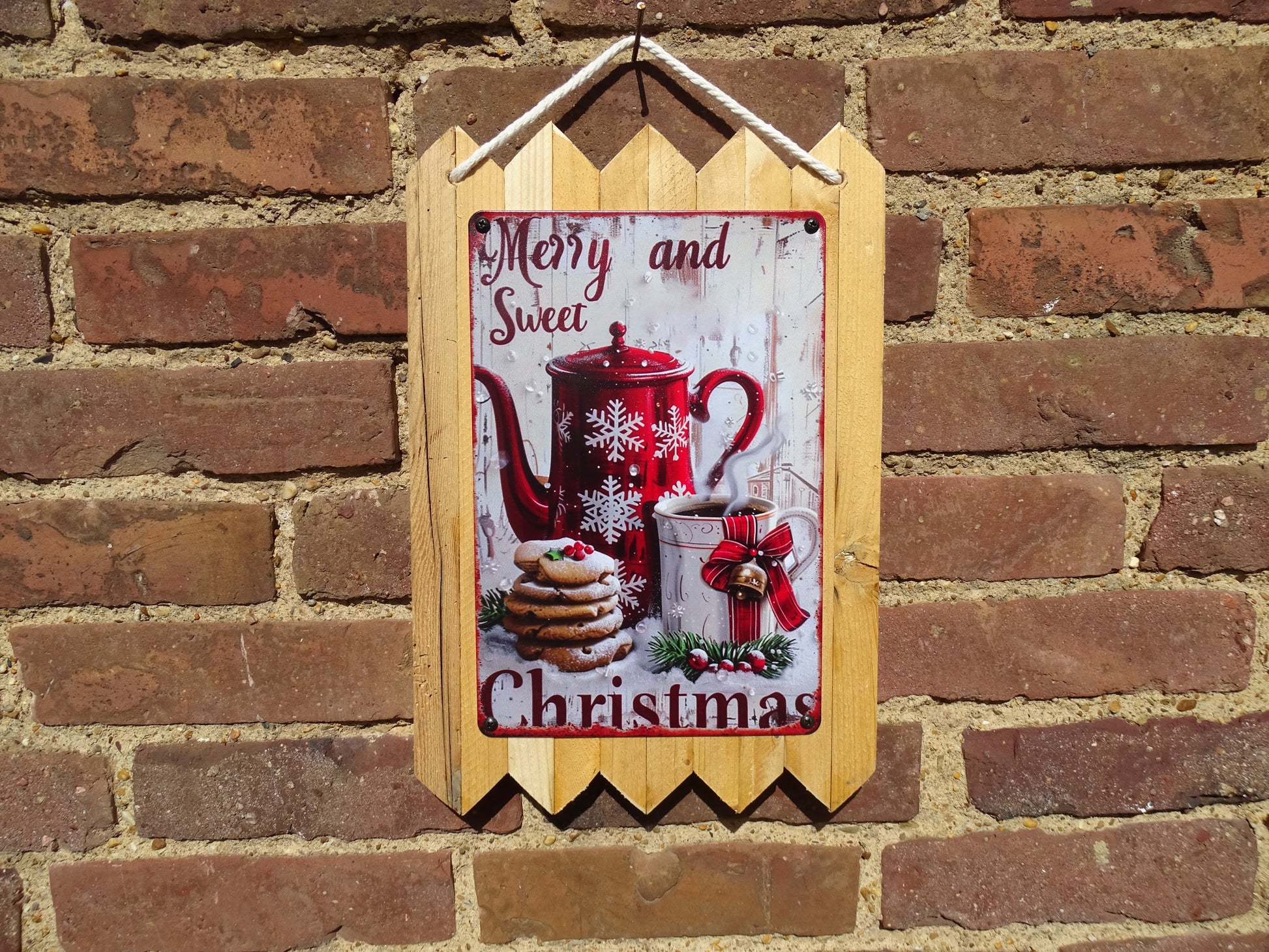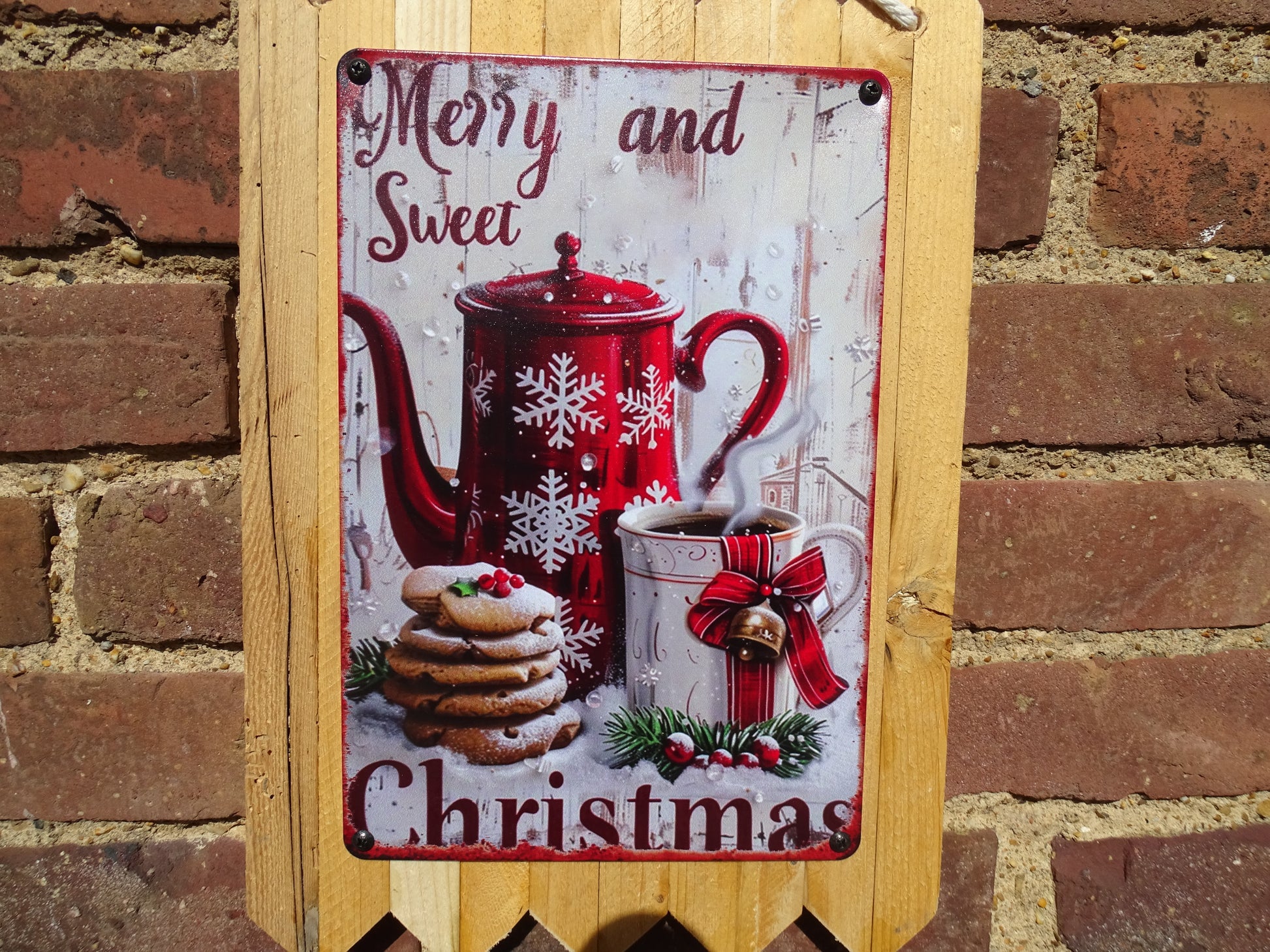 Merry and sweet Christmas - Teekanne und Kekse - personalisierte Weihnachtsdeko - Blechschild - handgefertigt auf Altholz