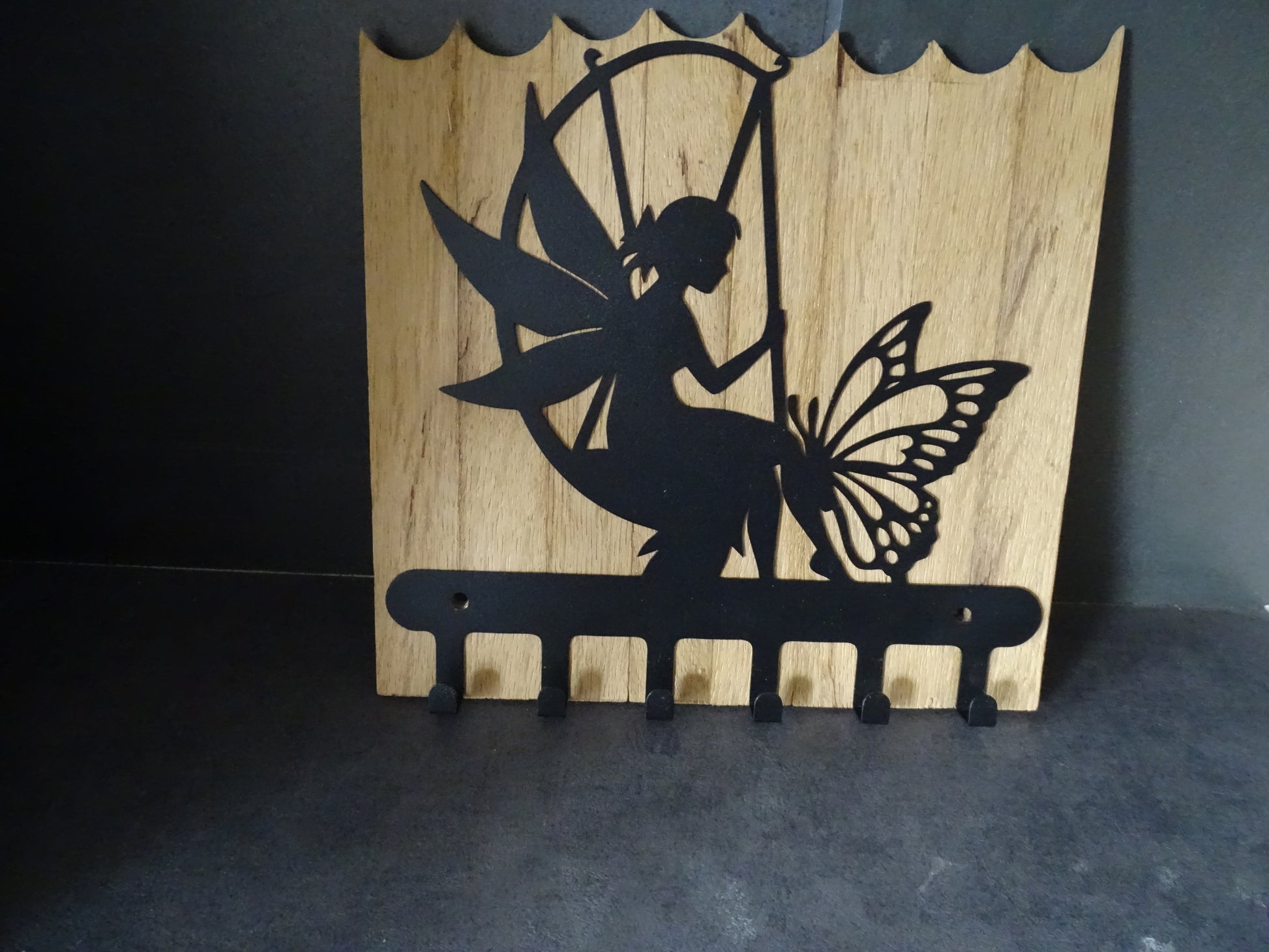 Schlüsselboard mit Fee Motiv | Handgemacht Altholz | Niedliche Deko & Metallhaken | Geschenk für Elfen-Fans