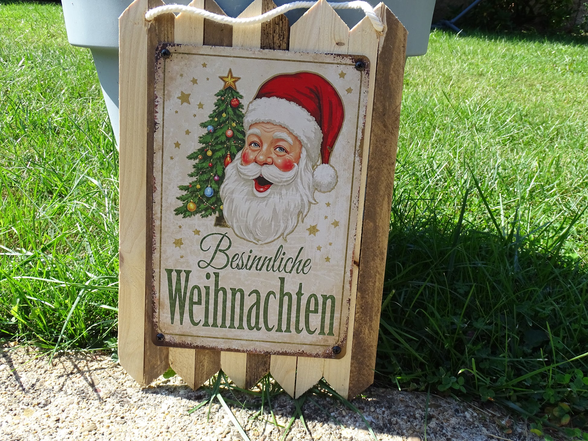 Blechschild auf echtem Altholz – Motiv „Besinnliche Weihnachten“.