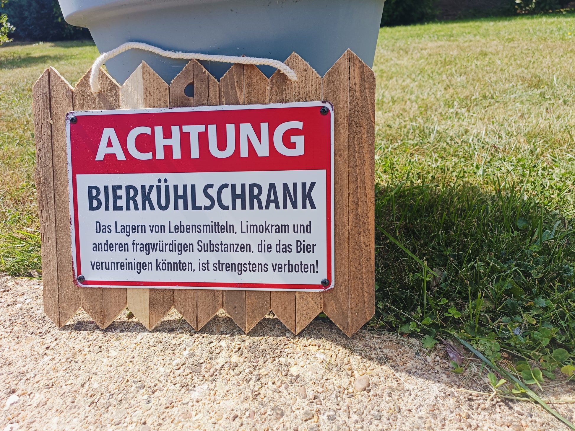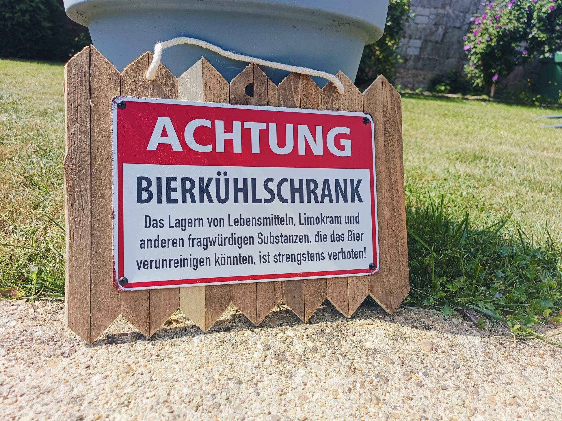 Blechschild „Bierkühlschrank – Limokram verboten, auf Altholz