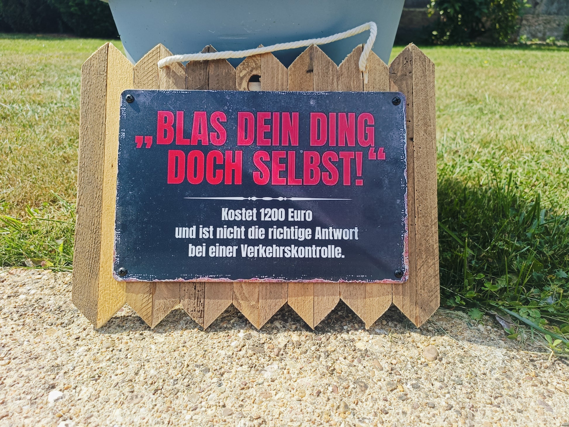 Blechschild Spruch – ‚Blas dein Ding doch selbst‘ | Lustiges Spruchschild, Handmade Wanddeko auf Altholz