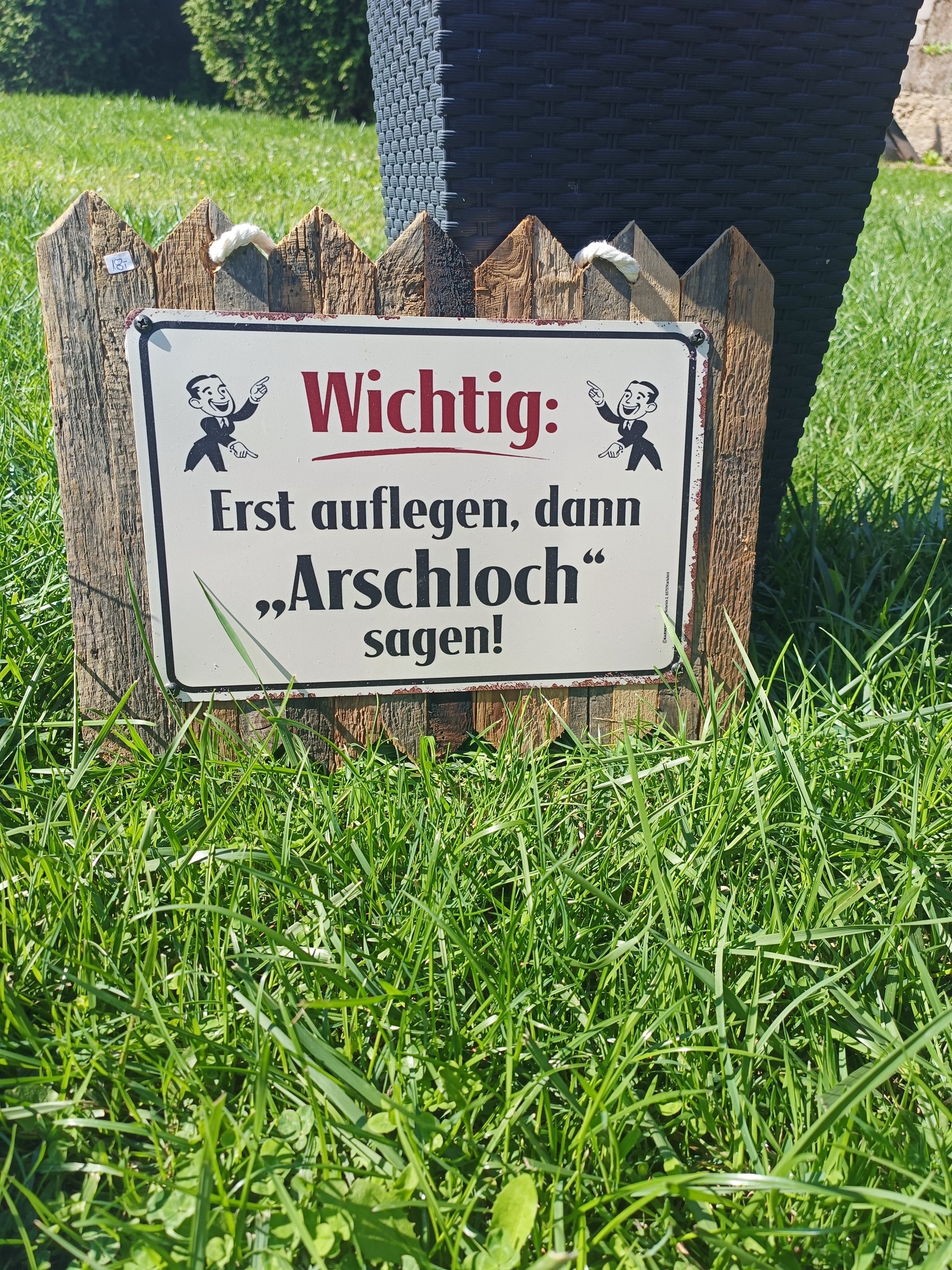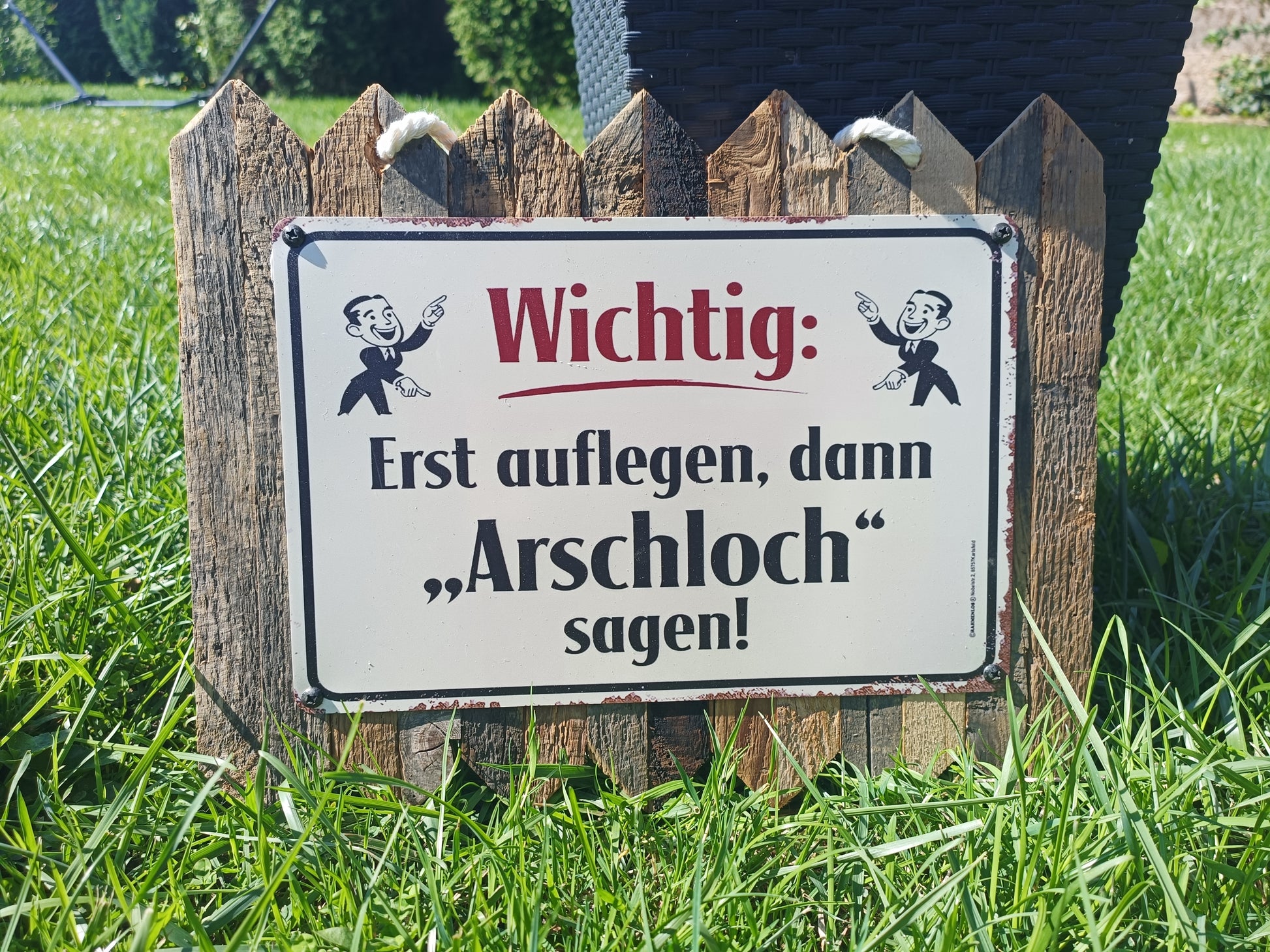 Für alle, die Humor mit einer Prise Direktheit lieben: Dieses Blechschild mit dem Spruch „Erst auflegen – dann Arschloch sagen“ sorgt garantiert für Lacher. Auf rustikalem Altholz montiert, ist es ein originelles Deko-Highlight für Zuhause, Büro oder Partykeller.