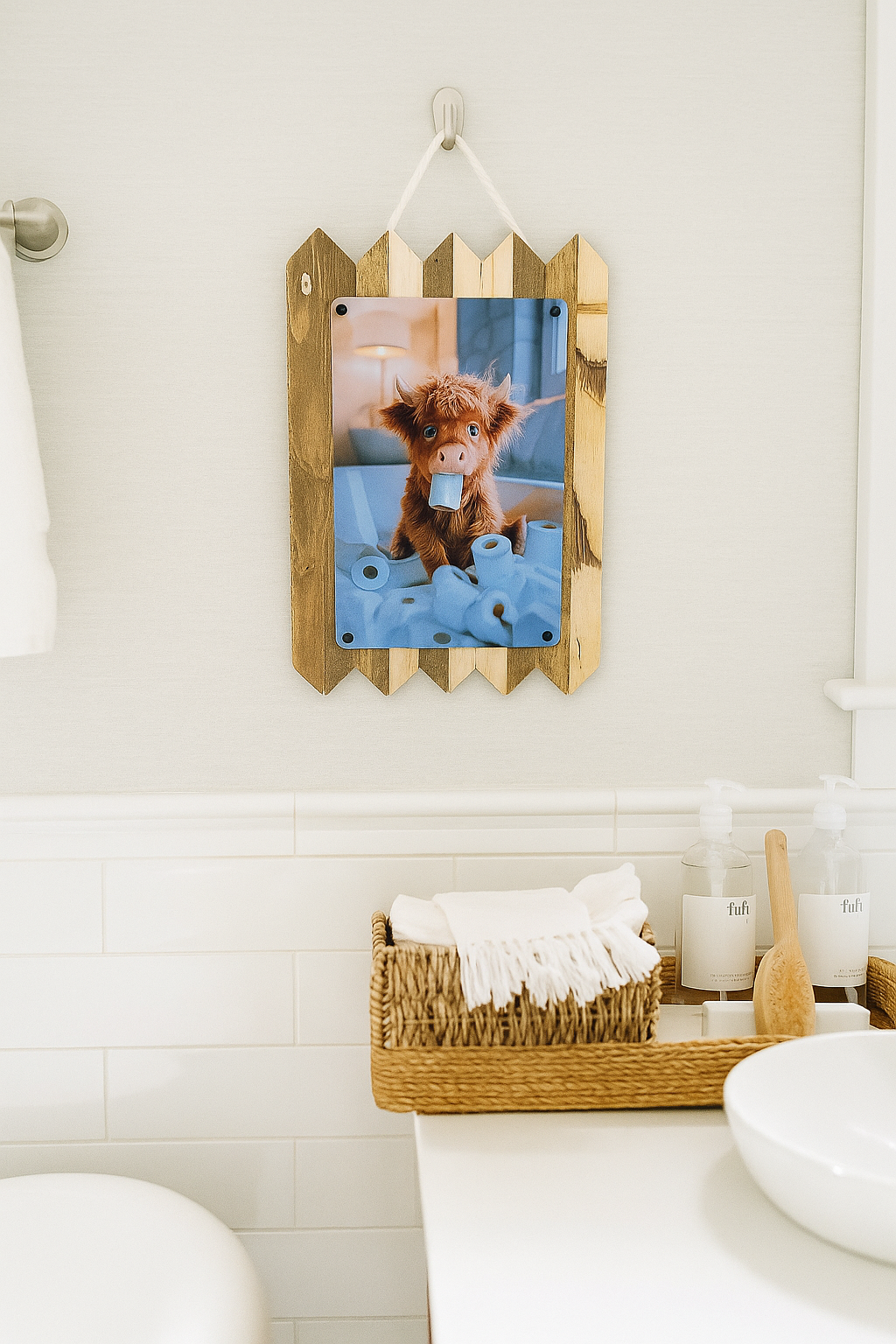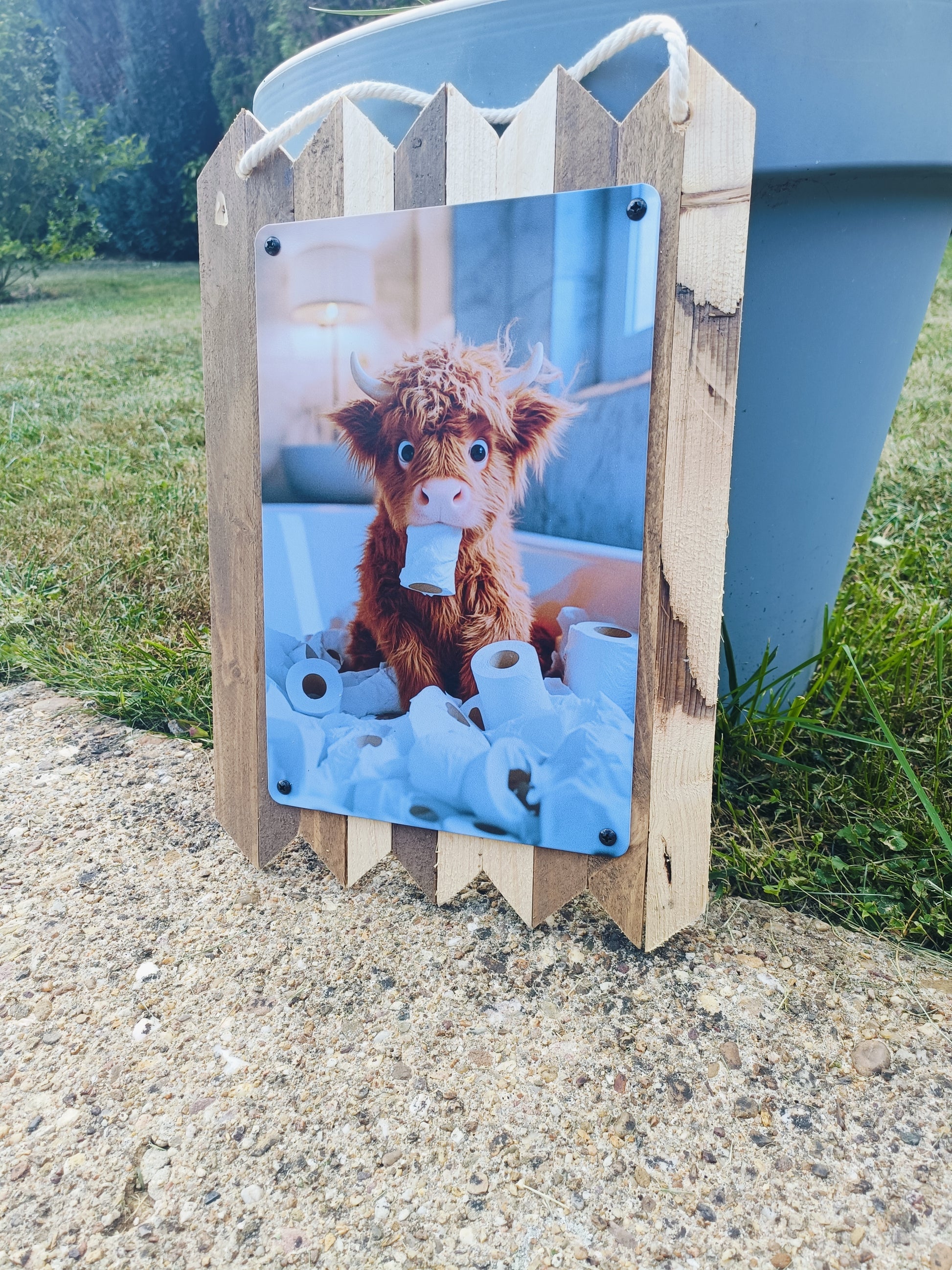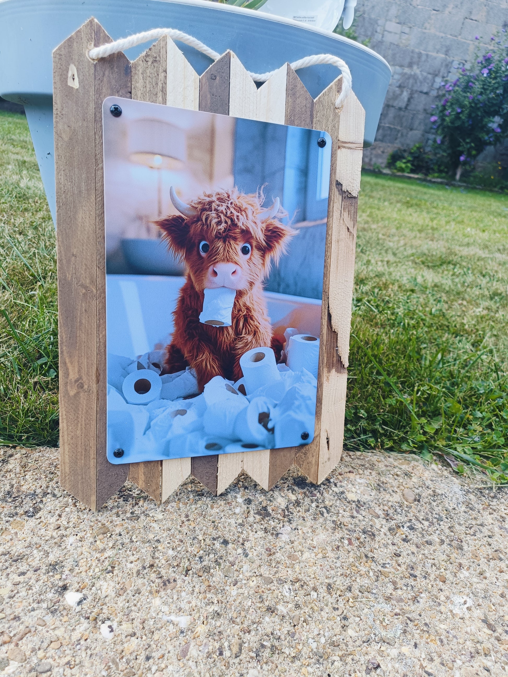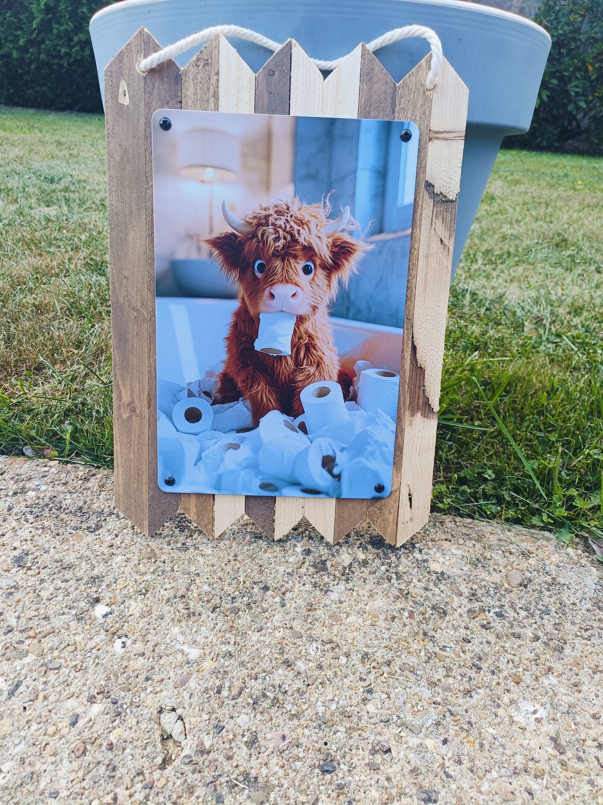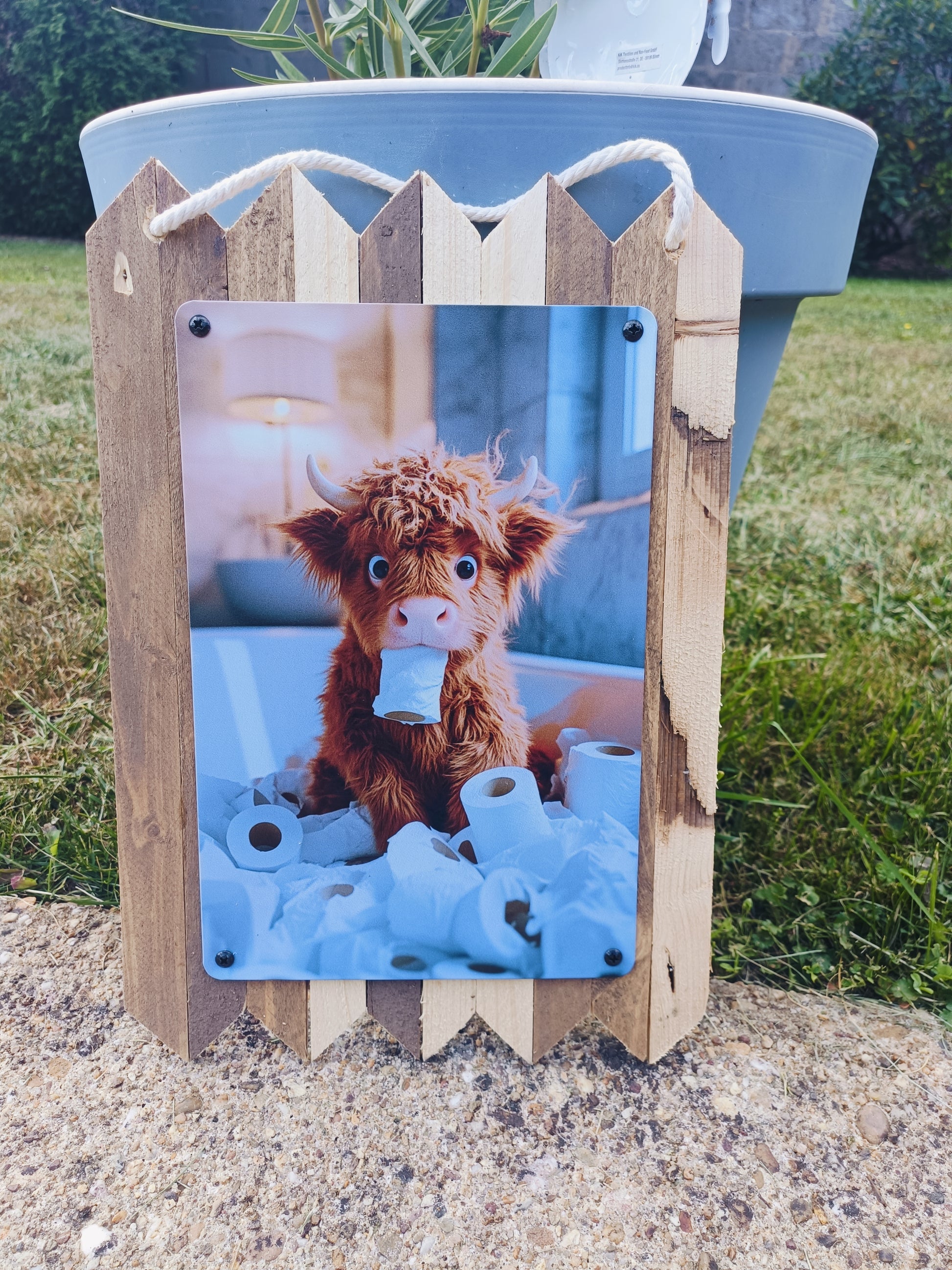 Blechschild Highland Rind mit Klopapierrolle – Lustige WC Deko, Handmade Wandschild