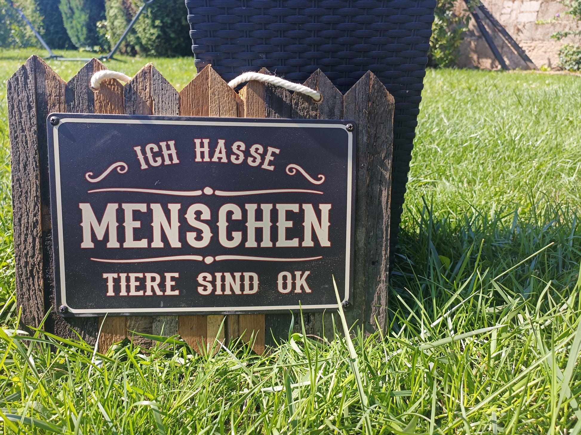 Blechschild - Ich hasse Menschen, Tiere sind ok, auf Altholz