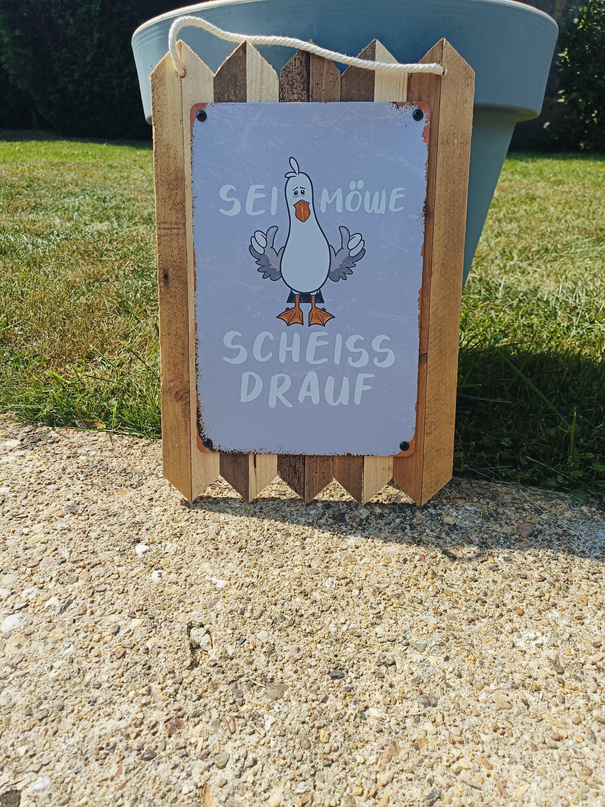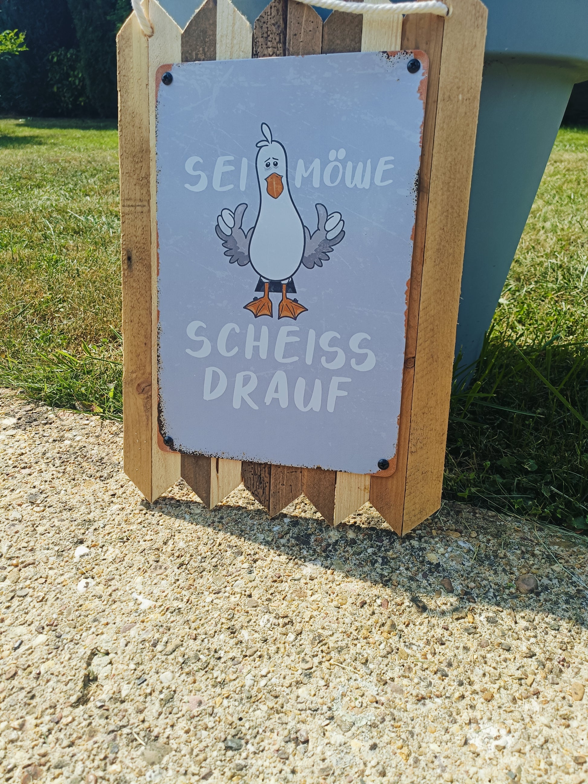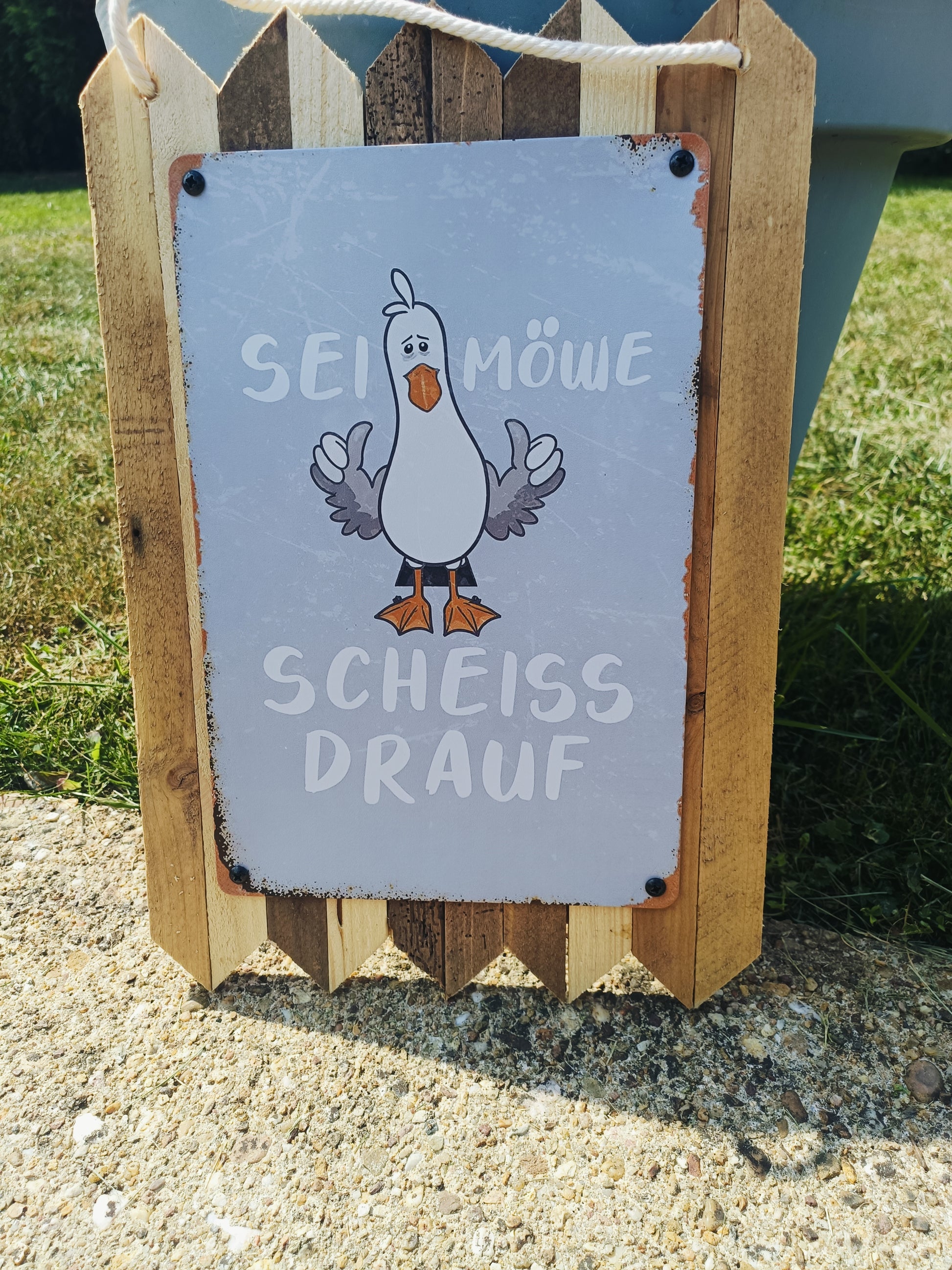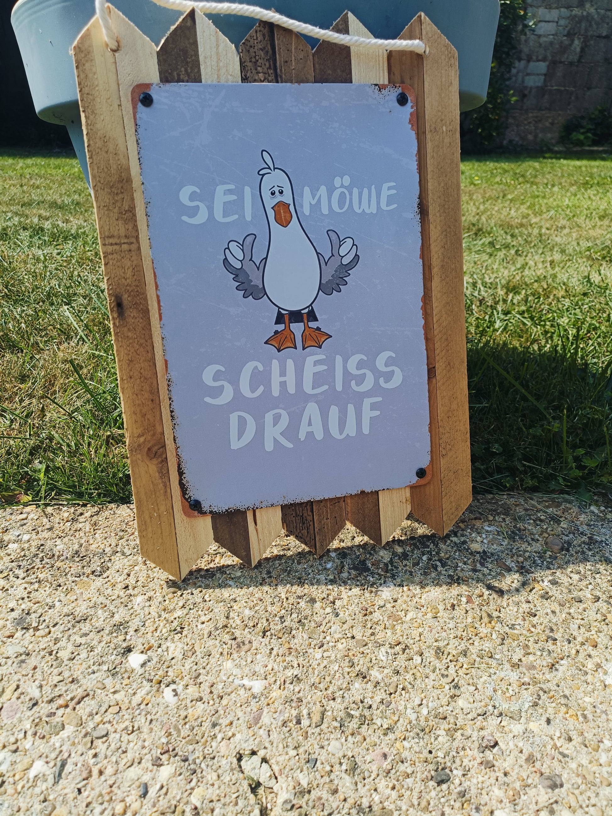 Blechschild Spruch – ‚Sei Möwe – scheiß drauf‘ | Lustiges Spruchschild, Handmade Wanddeko auf Altholz