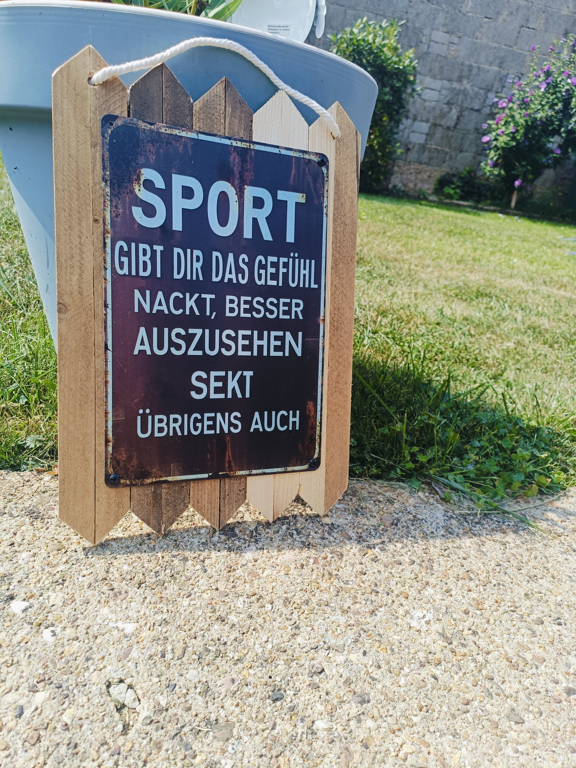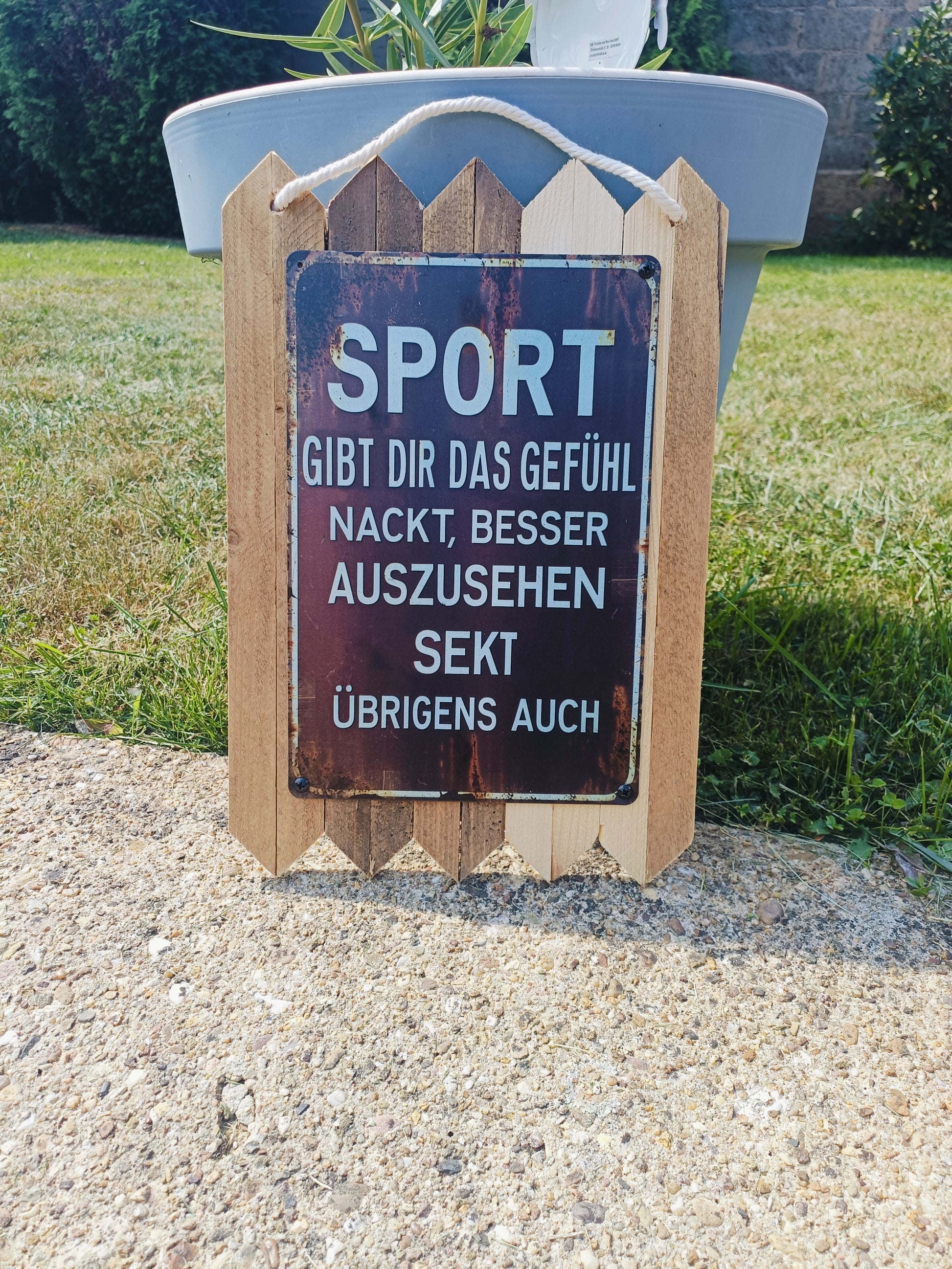Blechschild Spruch – ‚Sport gibt dir das Gefühl, nackt besser auszusehen – Sekt übrigens auch‘ | Lustiges Spruchschild, Handmade Wanddeko auf Althol