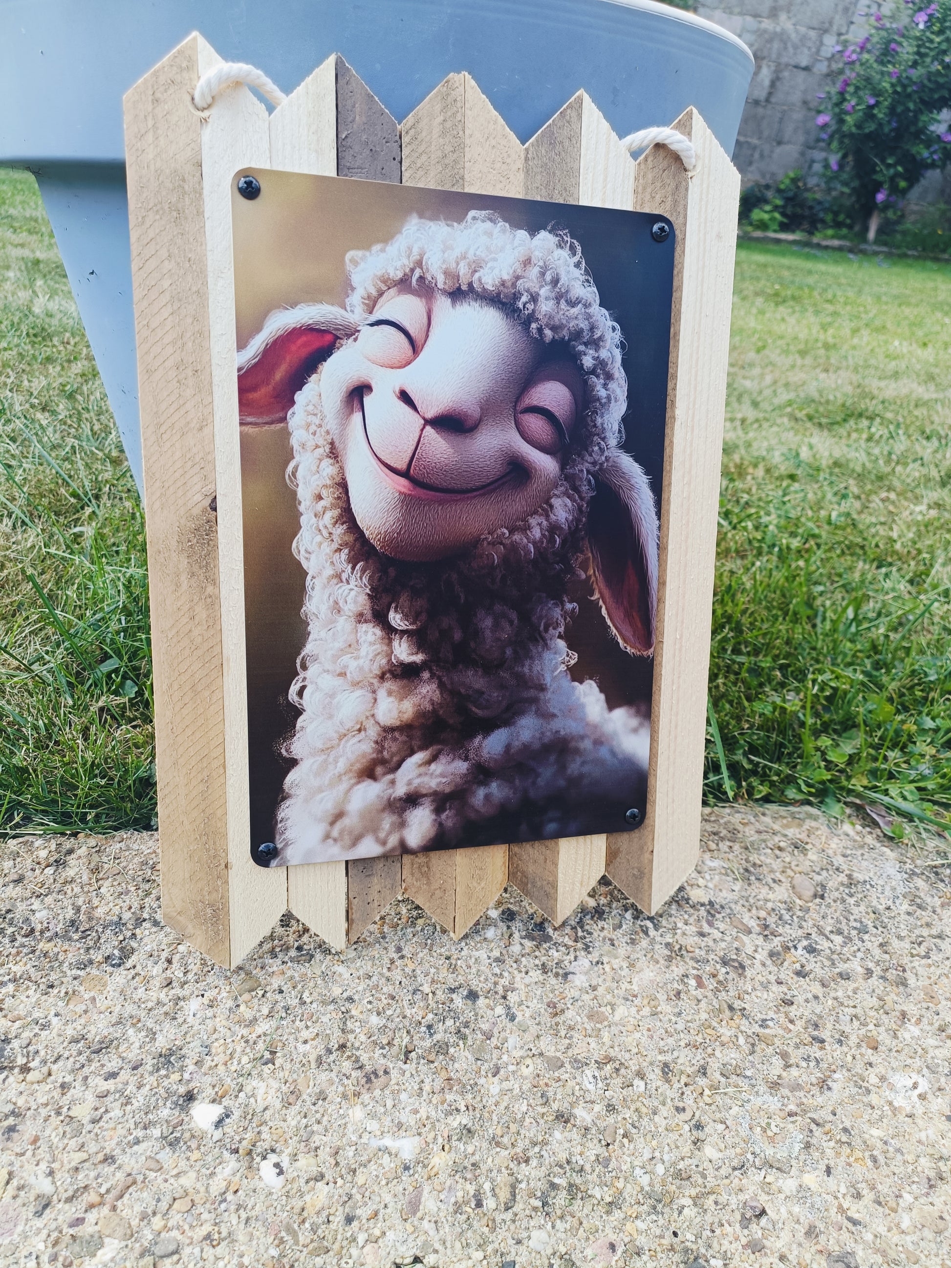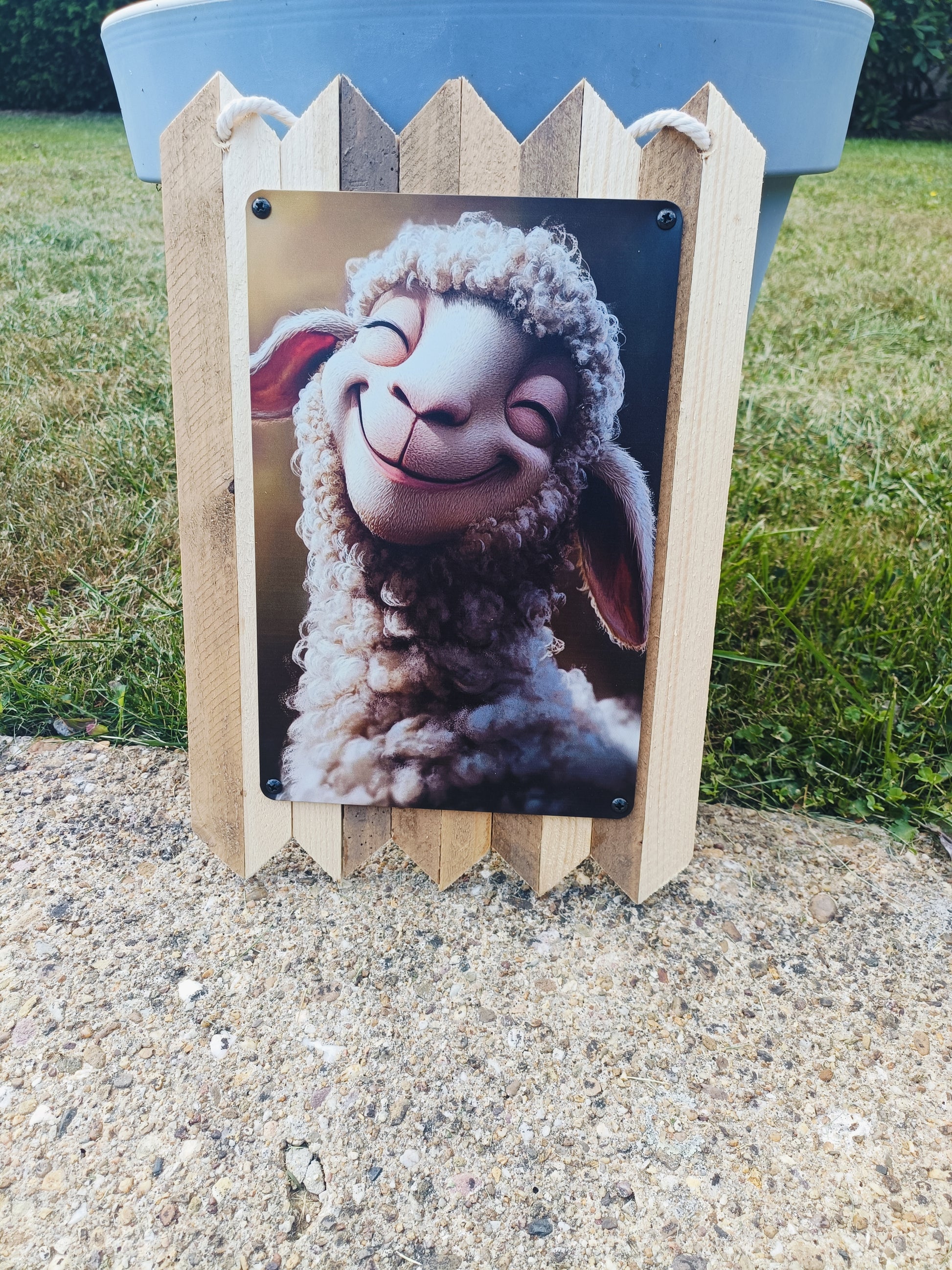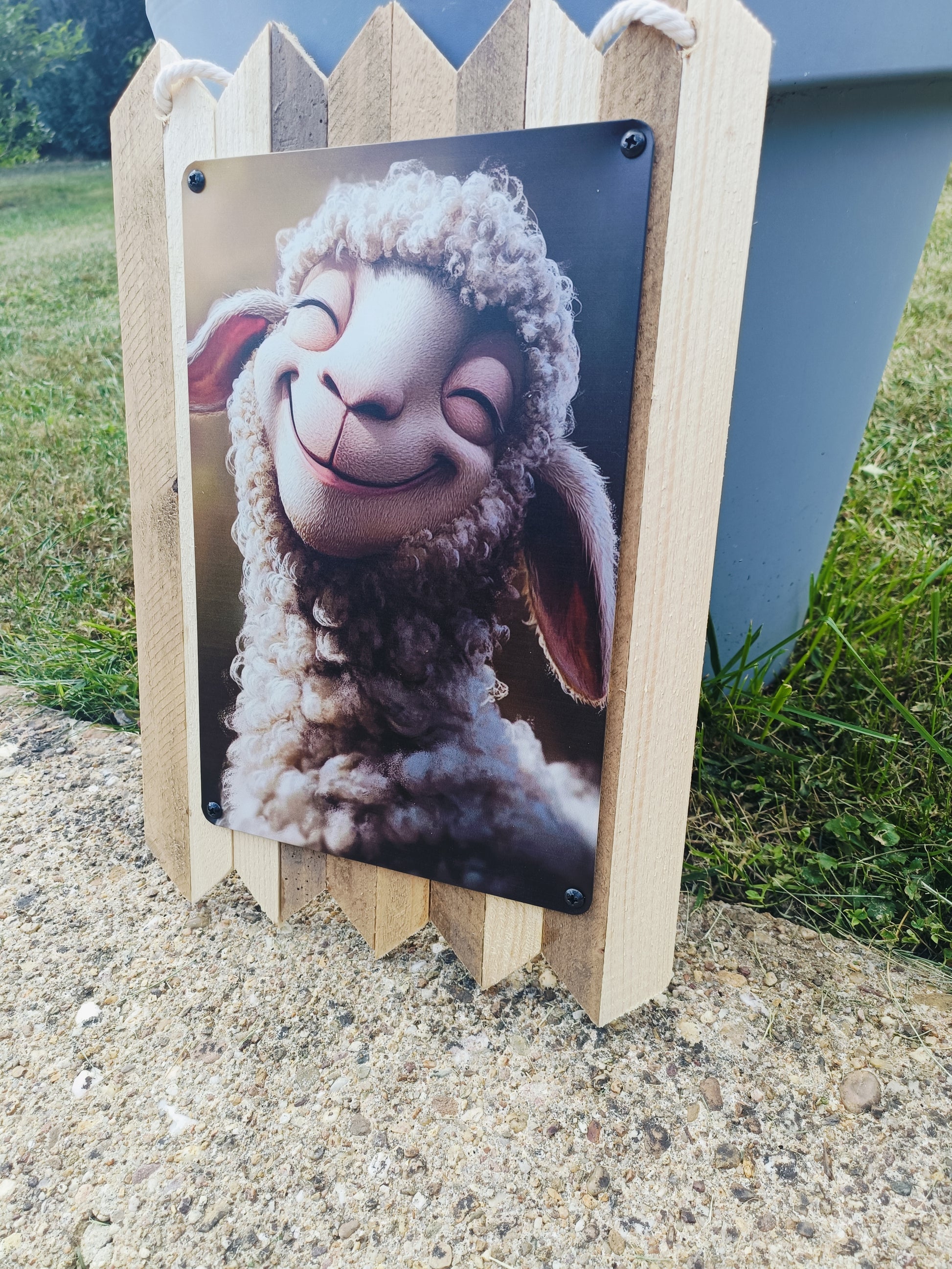 Blechschild grinsendes Schaf – Lustige Tier Wanddeko, Handmade Schild Vintage