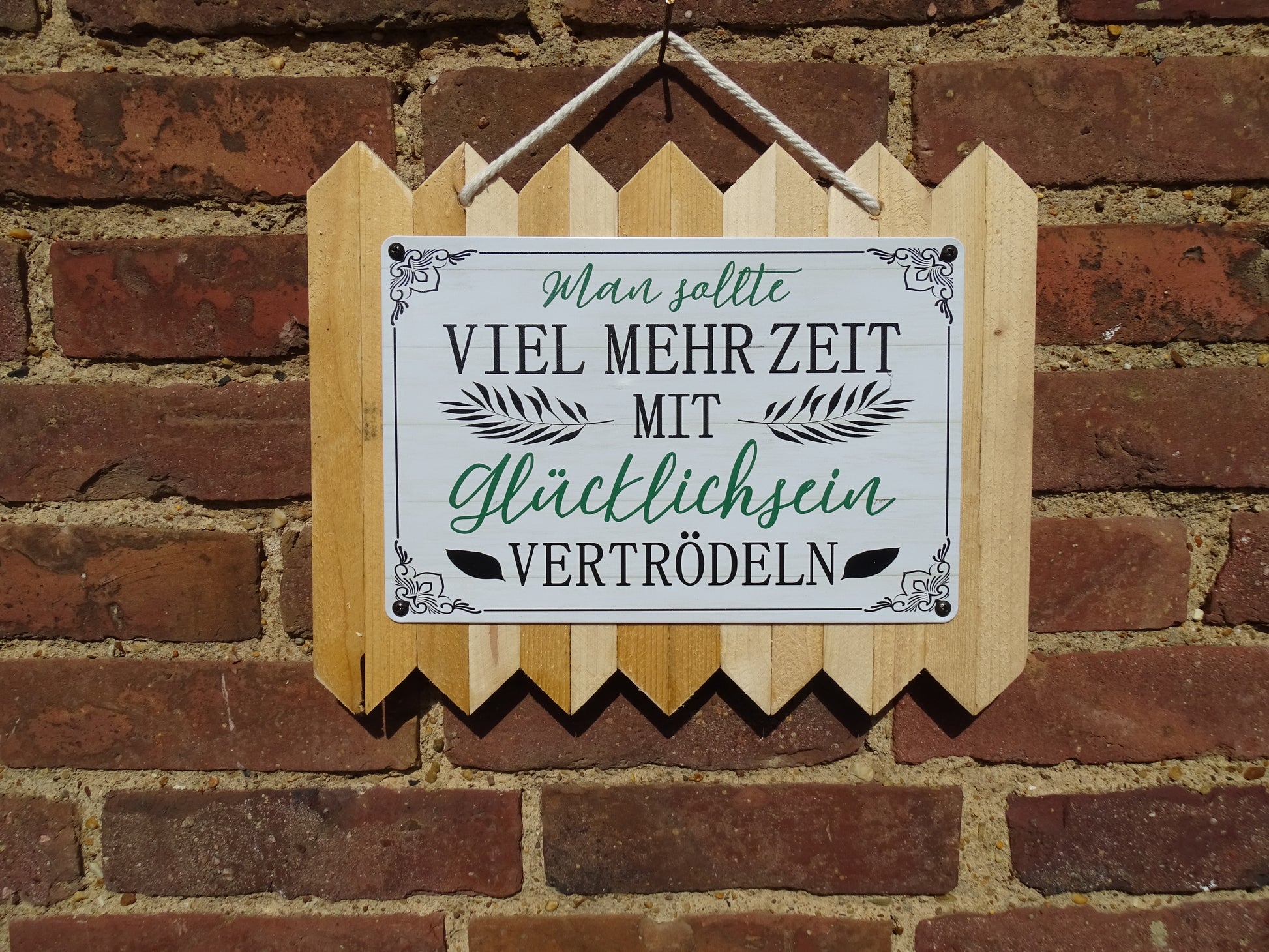 Man sollte viel mehr Zeit mit glücklich sein vertrödeln - personalisiertes Blechschild auf Altholz