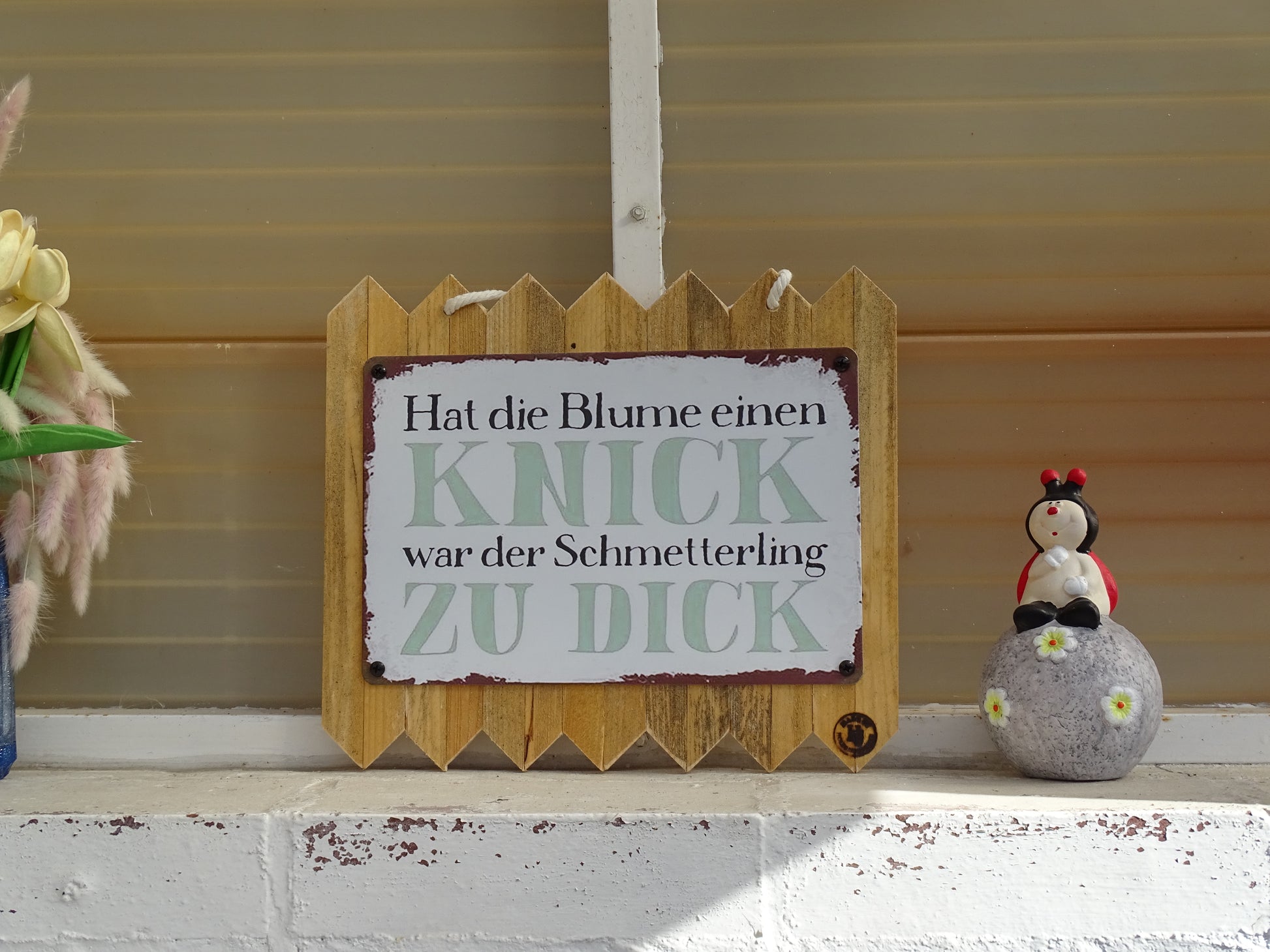 Blechschild – „Hat die Blume einen Knick, war der Schmetterling zu dick – Lustiges Garten Deko auf Altholz 35 x 25 cm