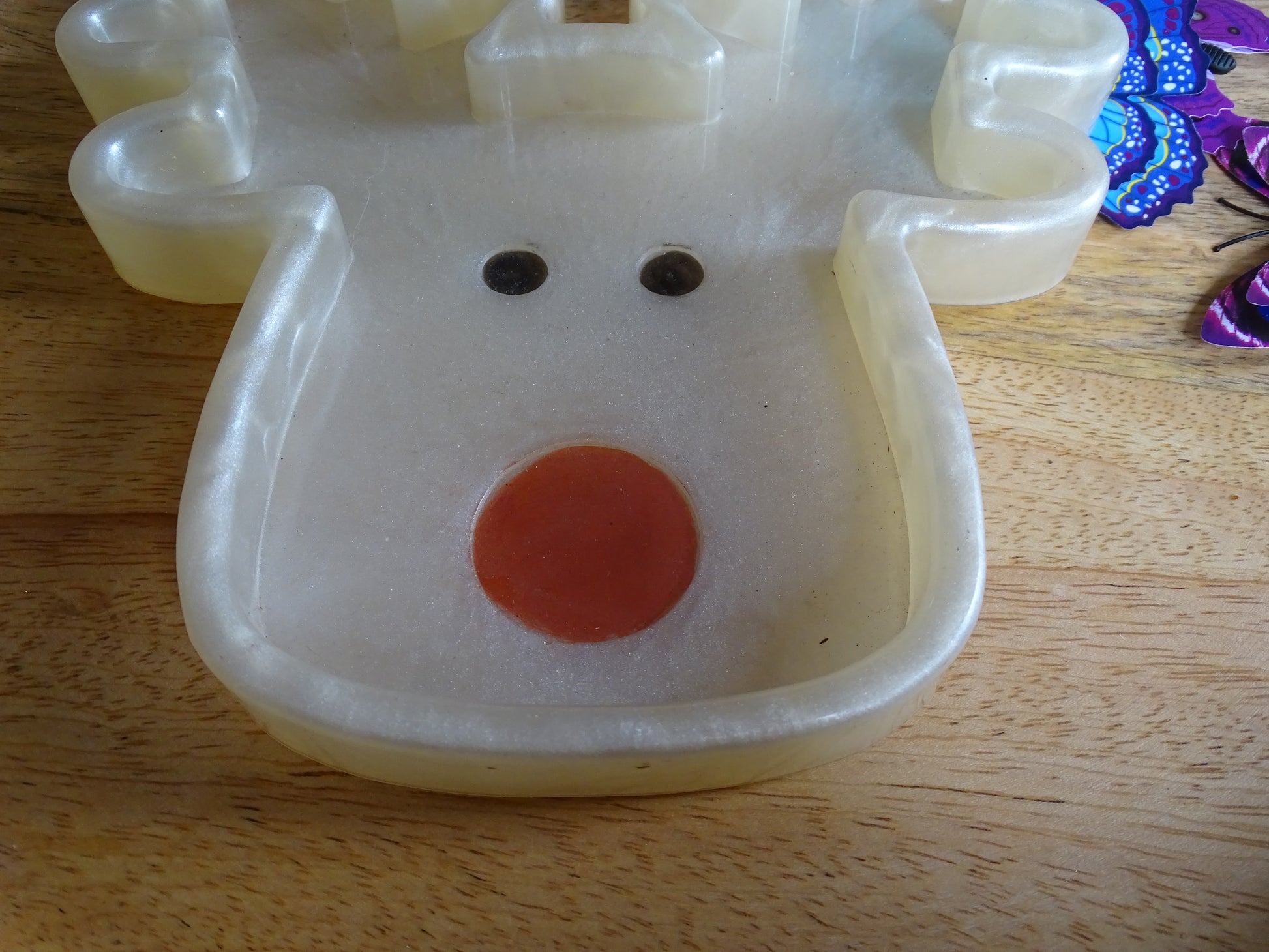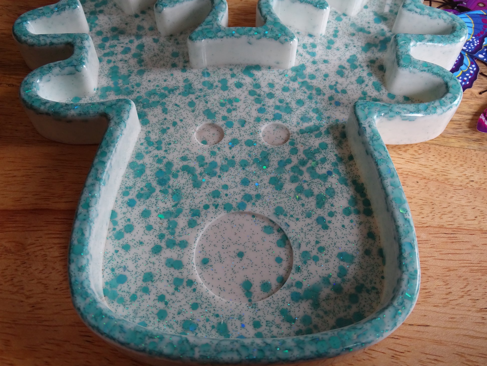 Dieser liebevoll von Hand gegossene Rentier-Teller aus Epoxidharz ist ein ganz besonderer Hingucker. Mit seinen Maßen von ca. 19 x 17 cm eignet er sich perfekt als dekorativer Teller für kleine Leckereien, Schmuck, Kerzen oder als festliche Tischdekoration.